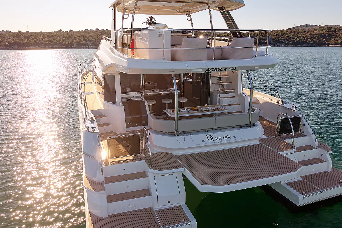 Key Features: • 4 beautifully appointed double cabins, accommodating up to 8 guests. • 3 professional crew members ensuring exceptional service. • Daily cabin cleaning and maintenance for a relaxed and comfortable experience. • Breakfast, Lunch and dinner meal per day, tailored to guests' preferences. • An exceptional performance and hull shape provide first-class stability and comfort • Open bar area connecting social areas between aft cockpit and salon/galley • Exceptional flybridge access from two (2) stairway locations