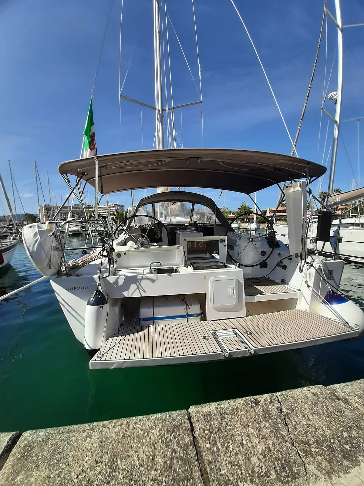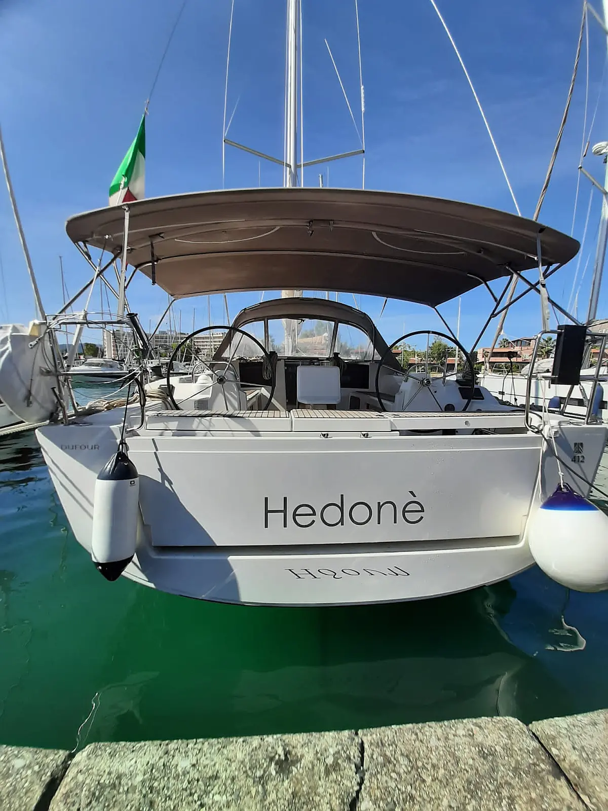Barbecue grill in cockpit, Swimming platform, Bimini, Refrigerator, Sprayhood, Cockpit speakers, Holding tank, Coffee maker