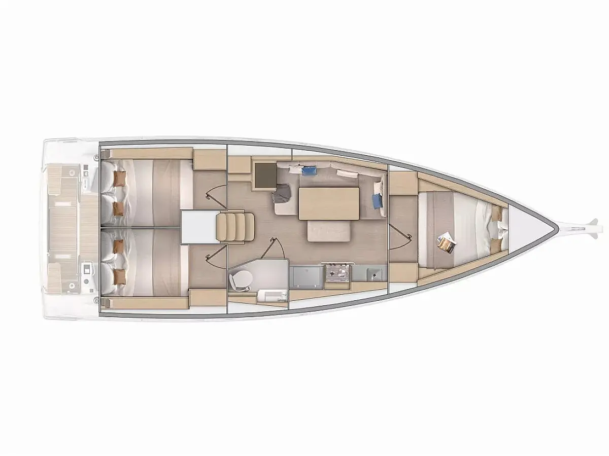 Dinghy, Outboard engine, Teak Cockpit, Cockpit cushions, Bimini, Coffee maker, Electric toilet, Refrigerator