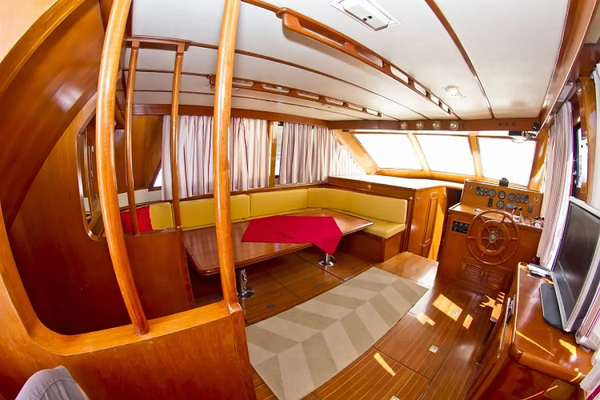 This yacht is equipped with a hydraulic gangway, bow thruster, autopilot, generator and