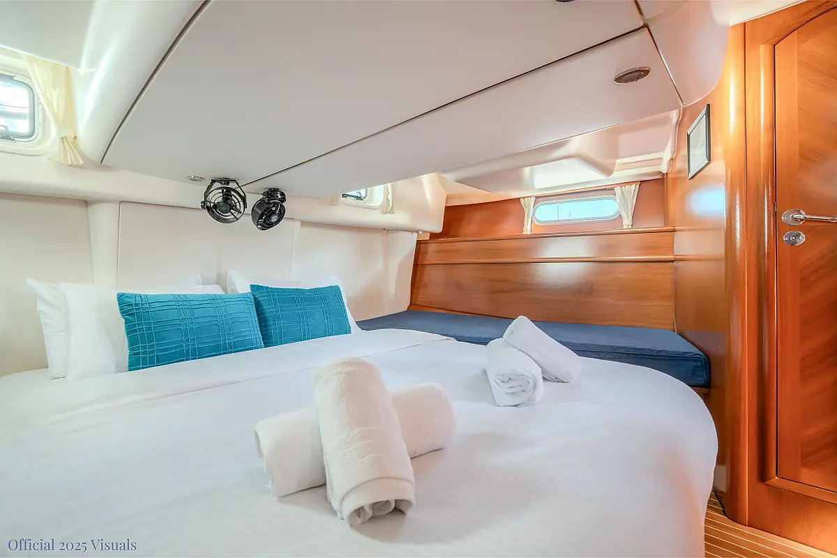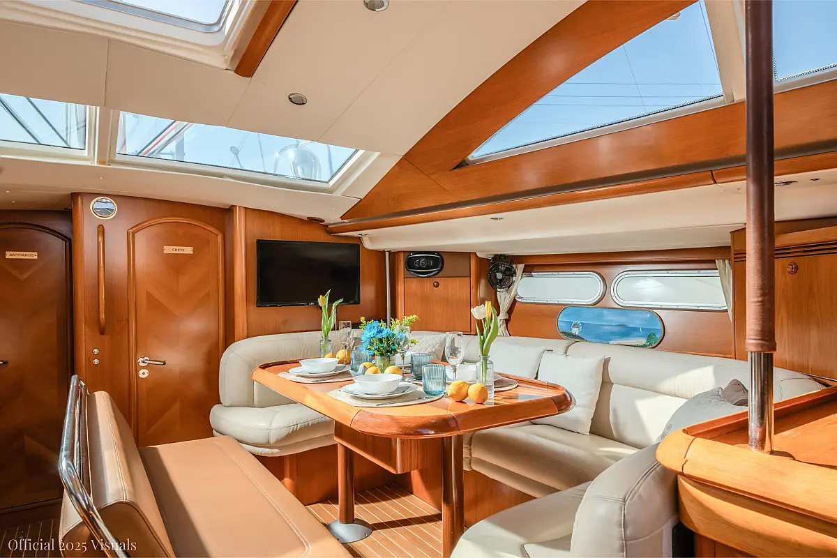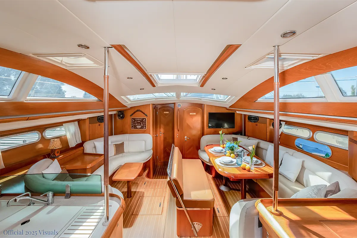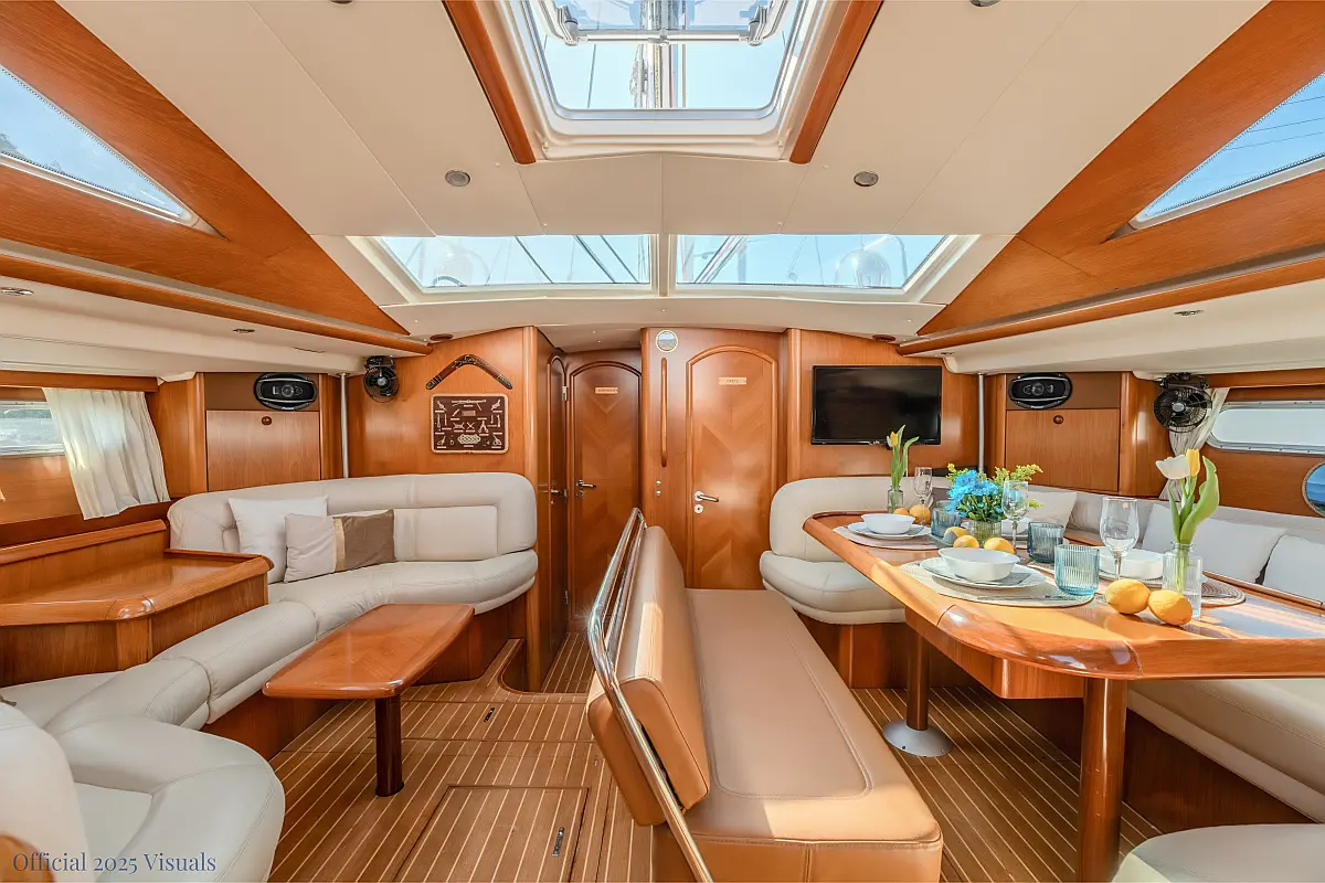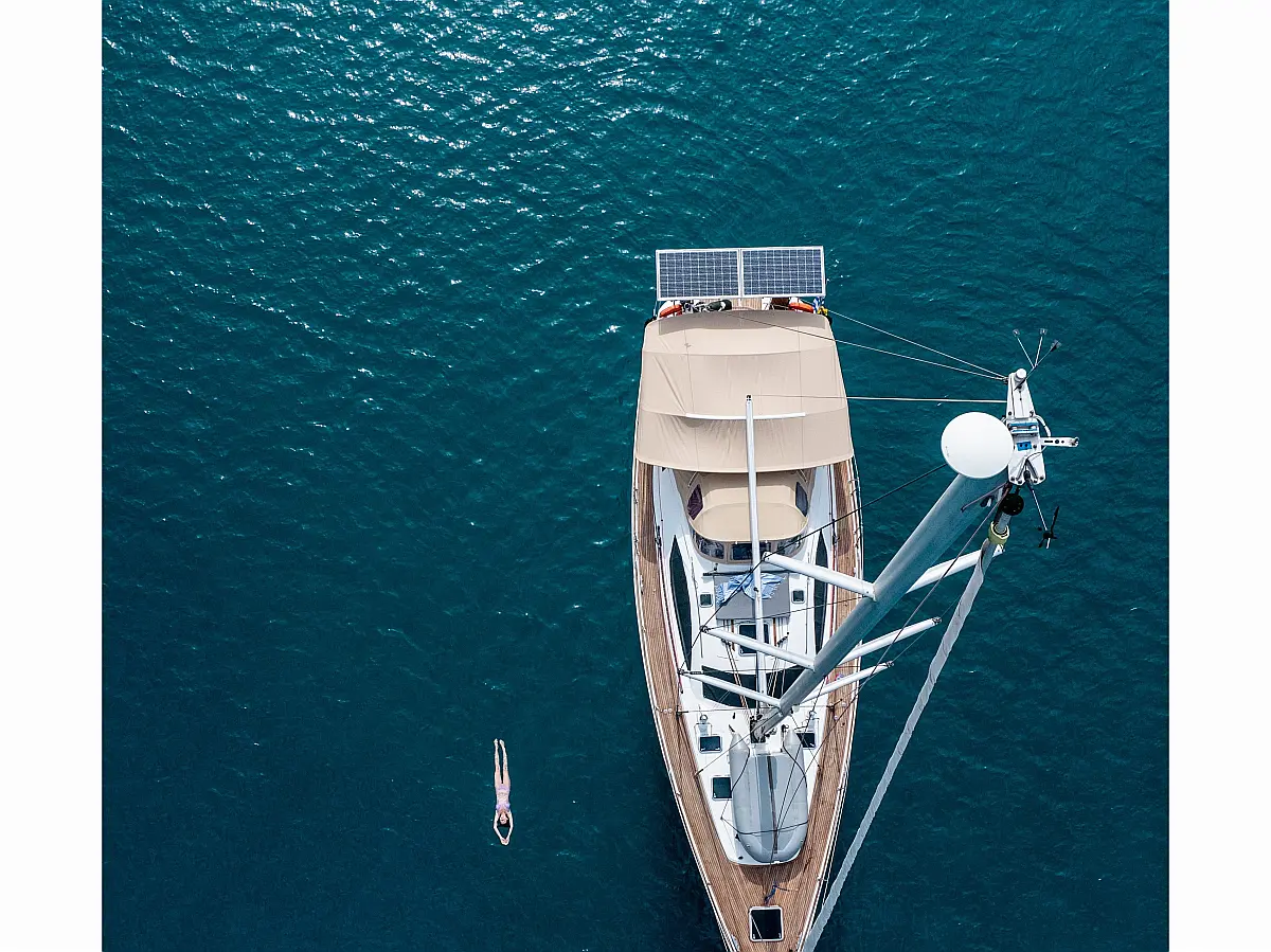 Dinghy, Outboard engine, Electric winches, Teak deck, Cockpit cushions, Bimini, Refrigerator, Heating, Wi-Fi & Internet, Solar Panels, Inverter