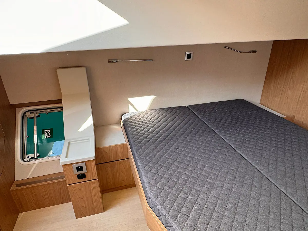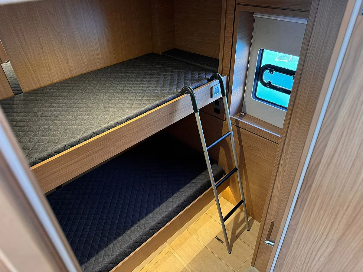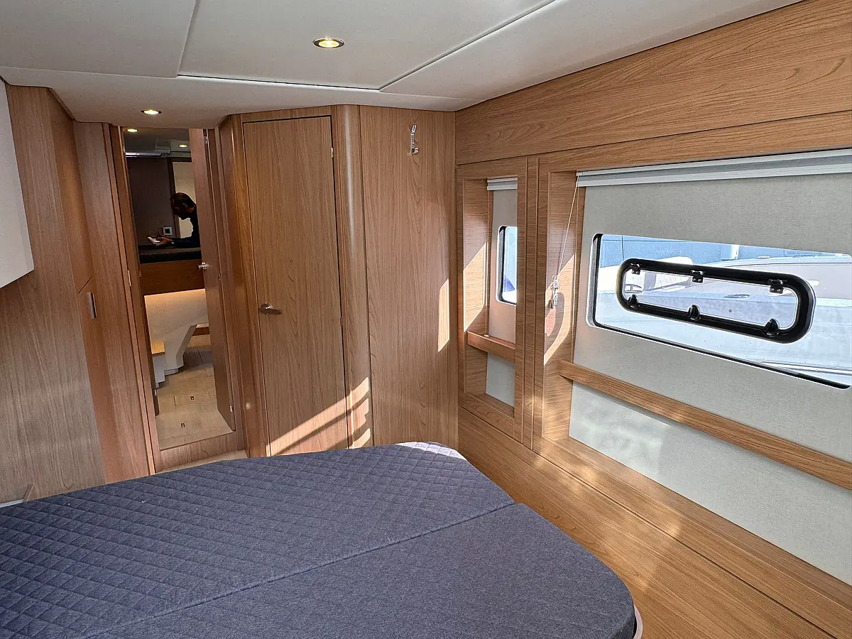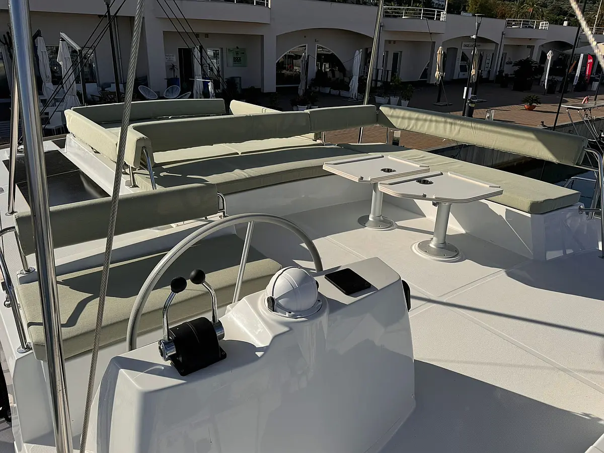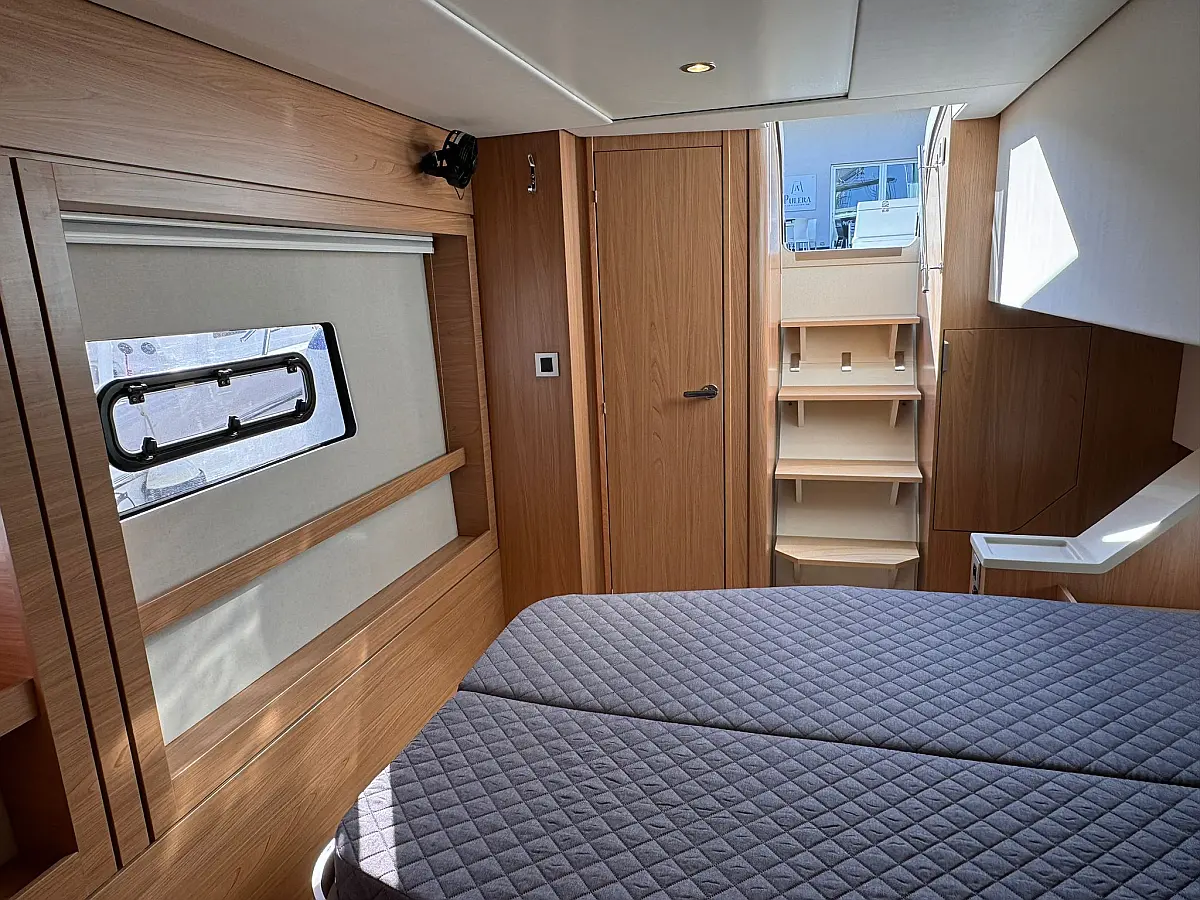 Desalinator, Zvočniki v kokpitu, Klima, Blazine v kokpitu, Električni wc, Generator, sončni kolektorji, teak kokpit, Hladilnik, Električni vitli, Inverter, Izvenkrmni motor