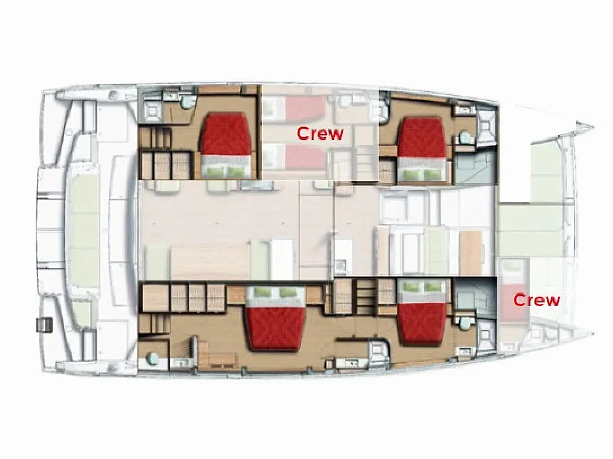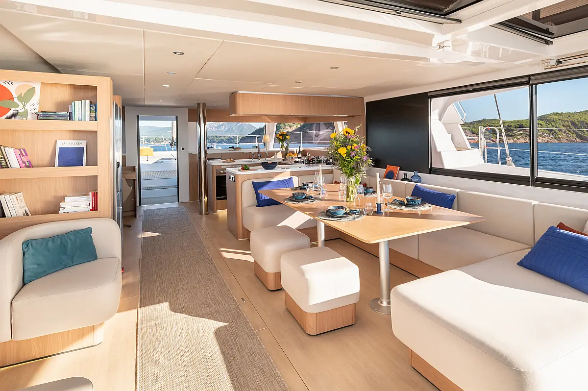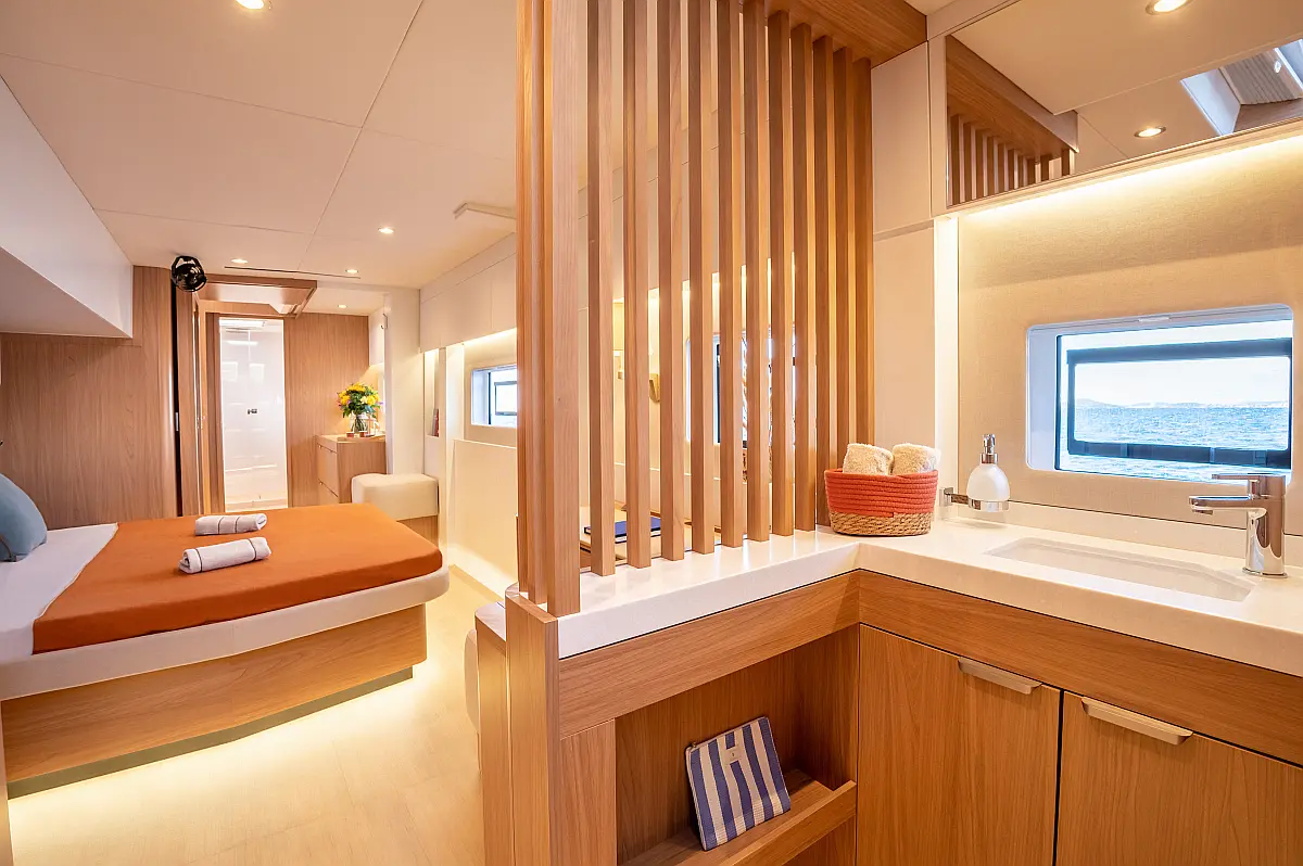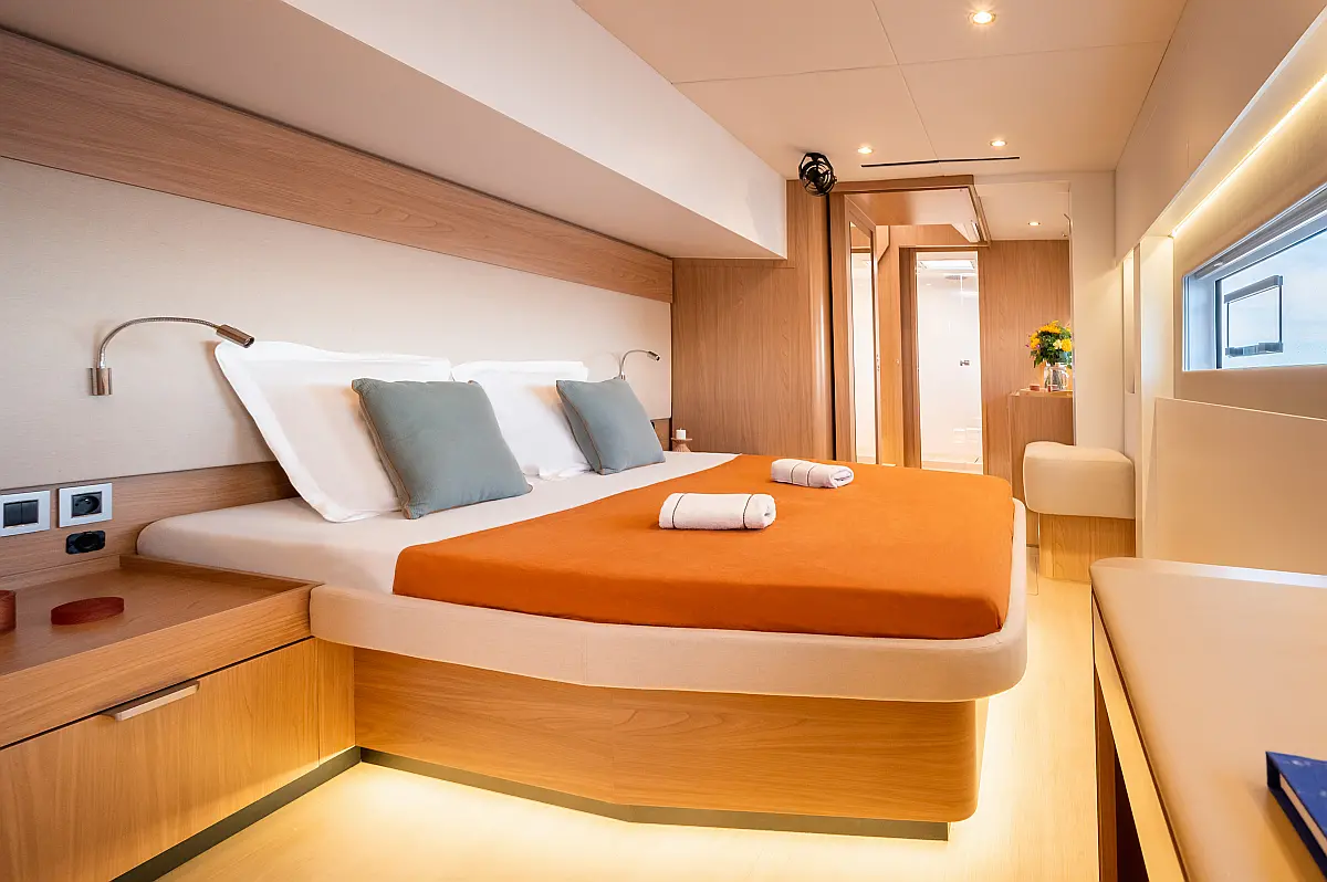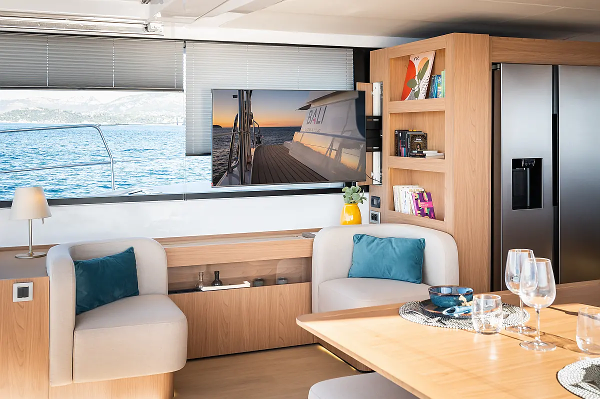 Inverter, Hladilnik, Blazine v kokpitu, Električni wc, Desalinator, Ledomat, sončni kolektorji, Zvočniki v kokpitu, Klima, Električni vitli, Teak paluba
