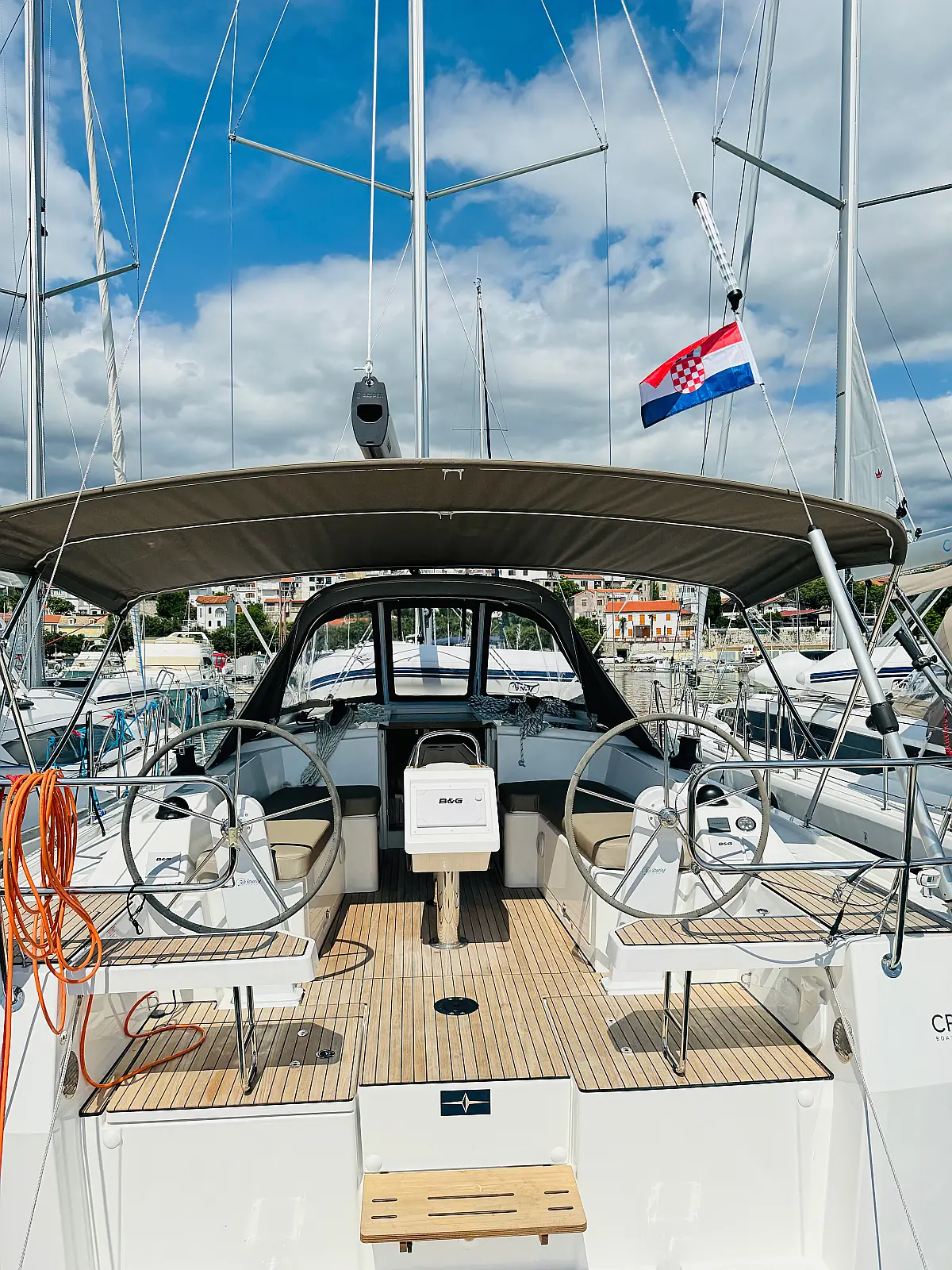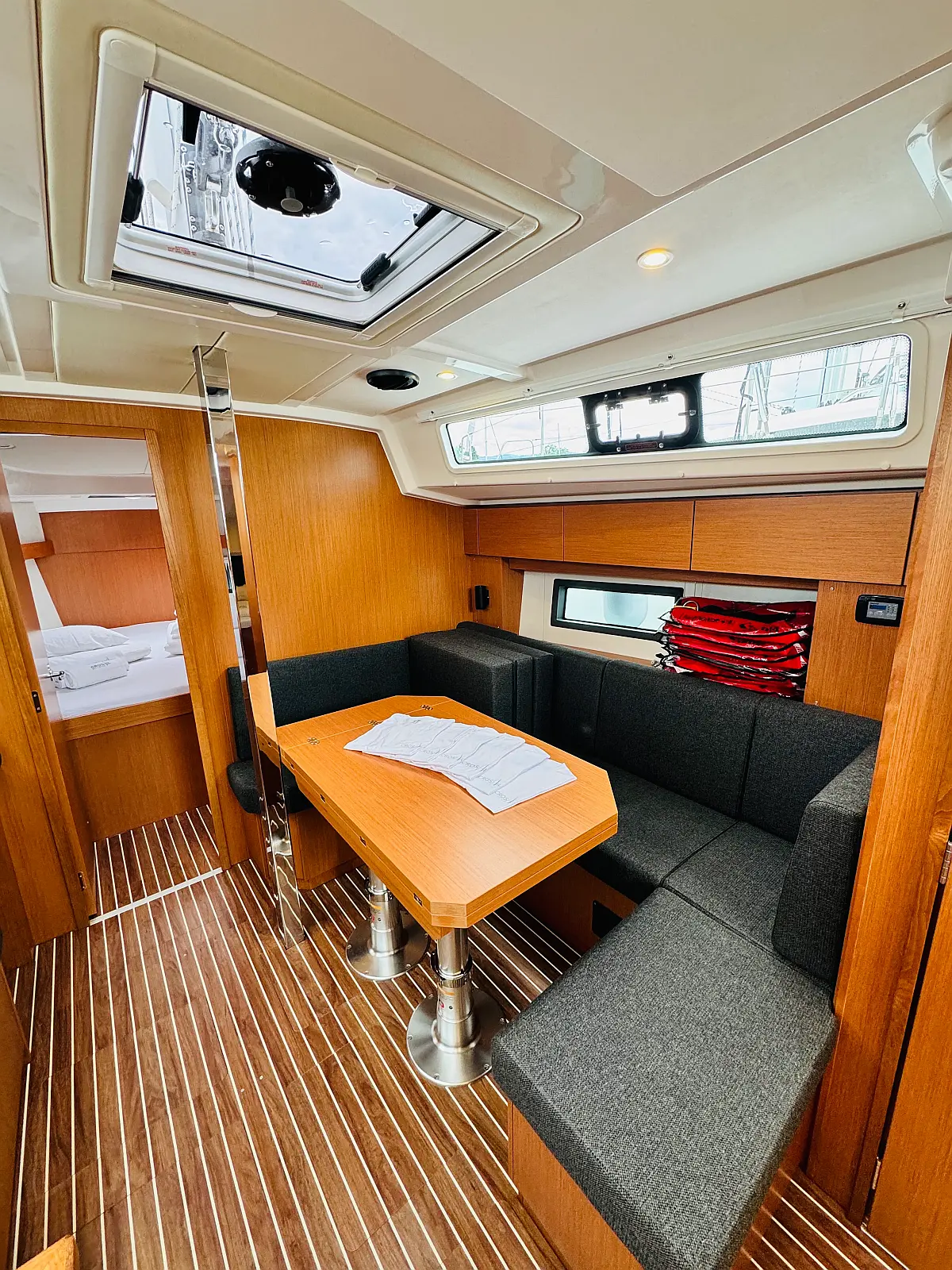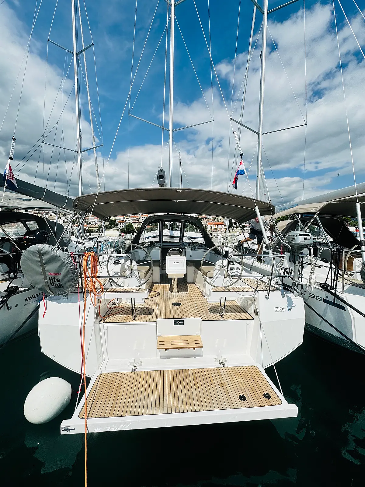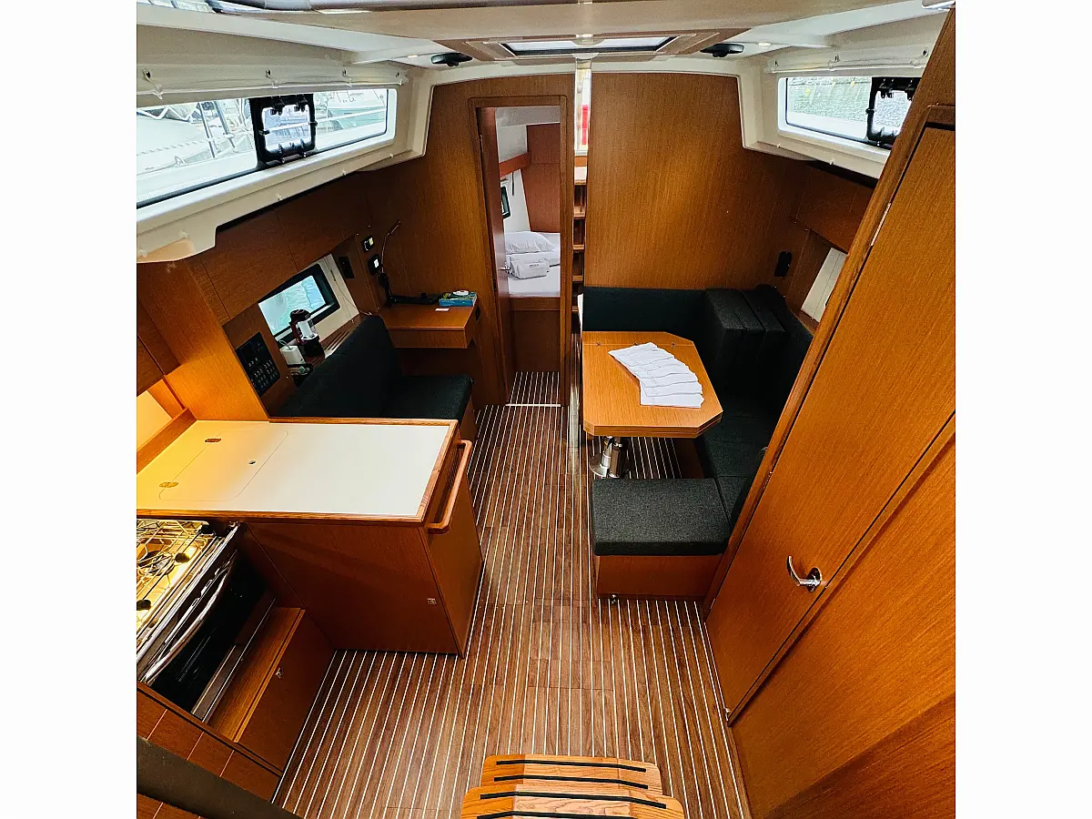 Hladilnik, Klima, Pomožni čoln, Sprayhood, Wi-Fi in internet, Zvočniki v kokpitu, sončni kolektorji, Bimini, teak kokpit