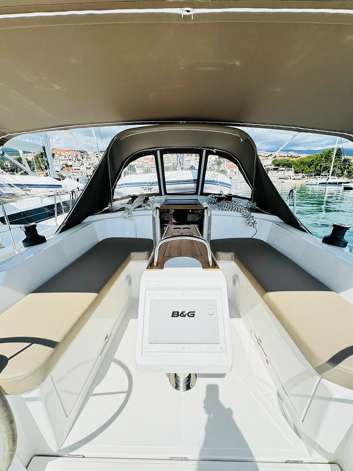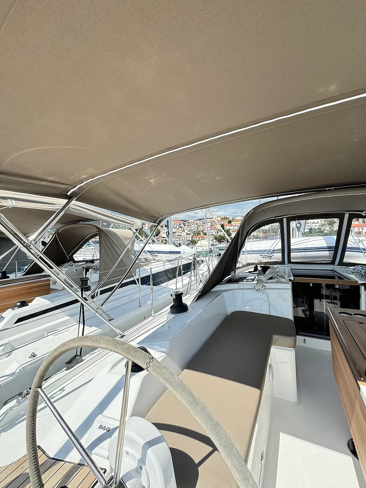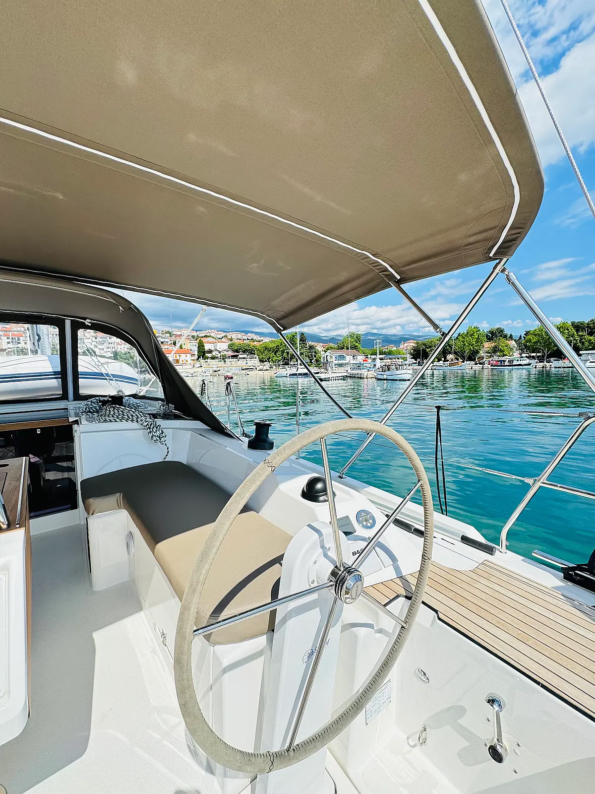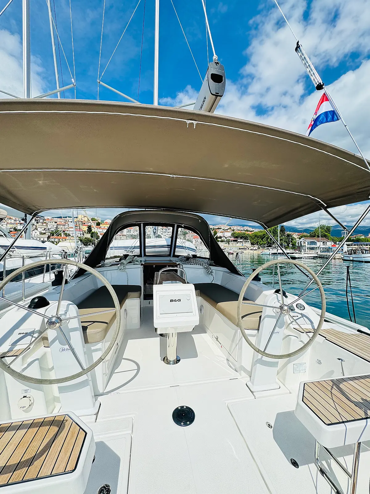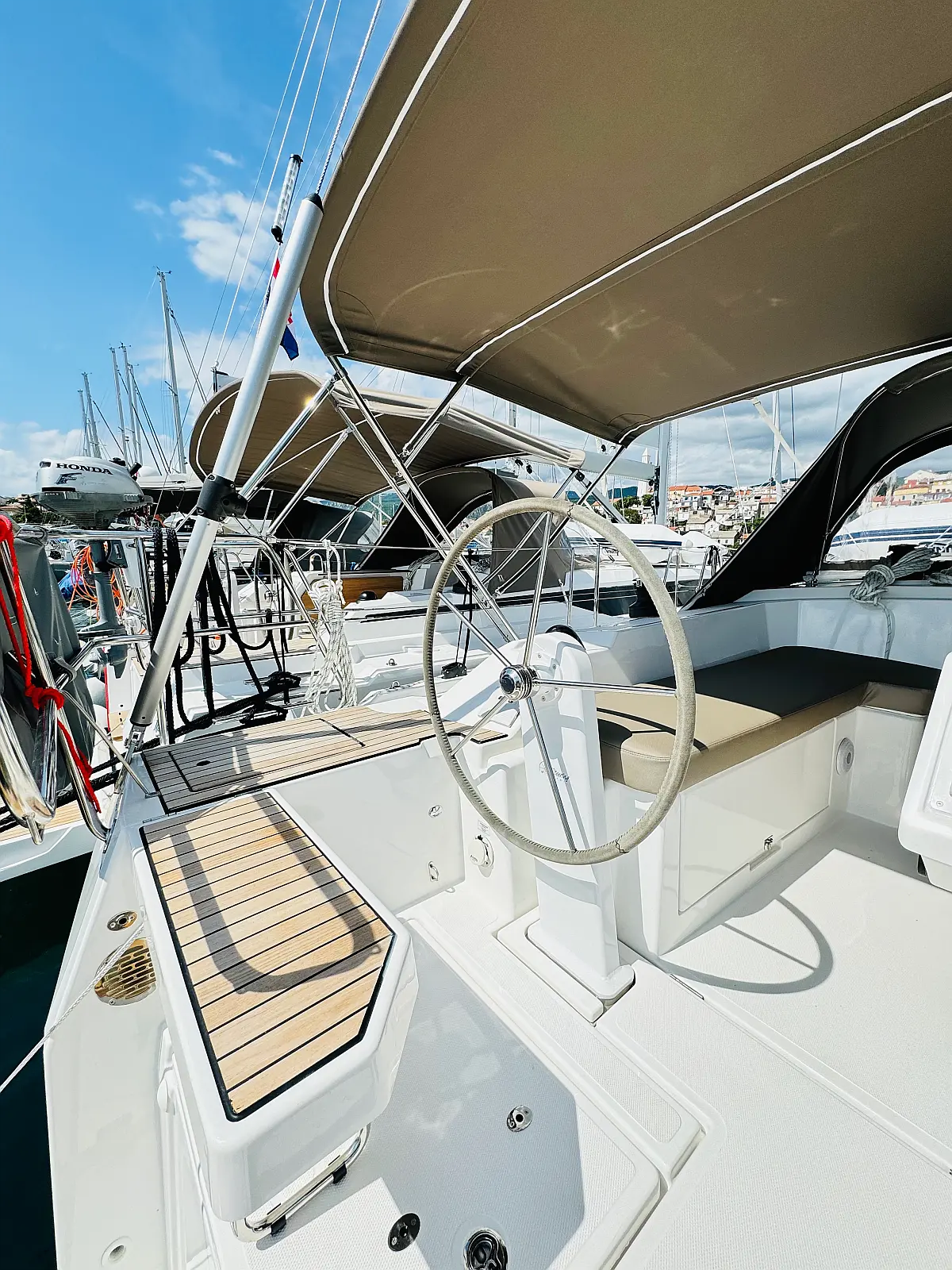 Hladilnik, Klima, Pomožni čoln, Sprayhood, Wi-Fi in internet, Zvočniki v kokpitu, sončni kolektorji, Bimini, teak kokpit