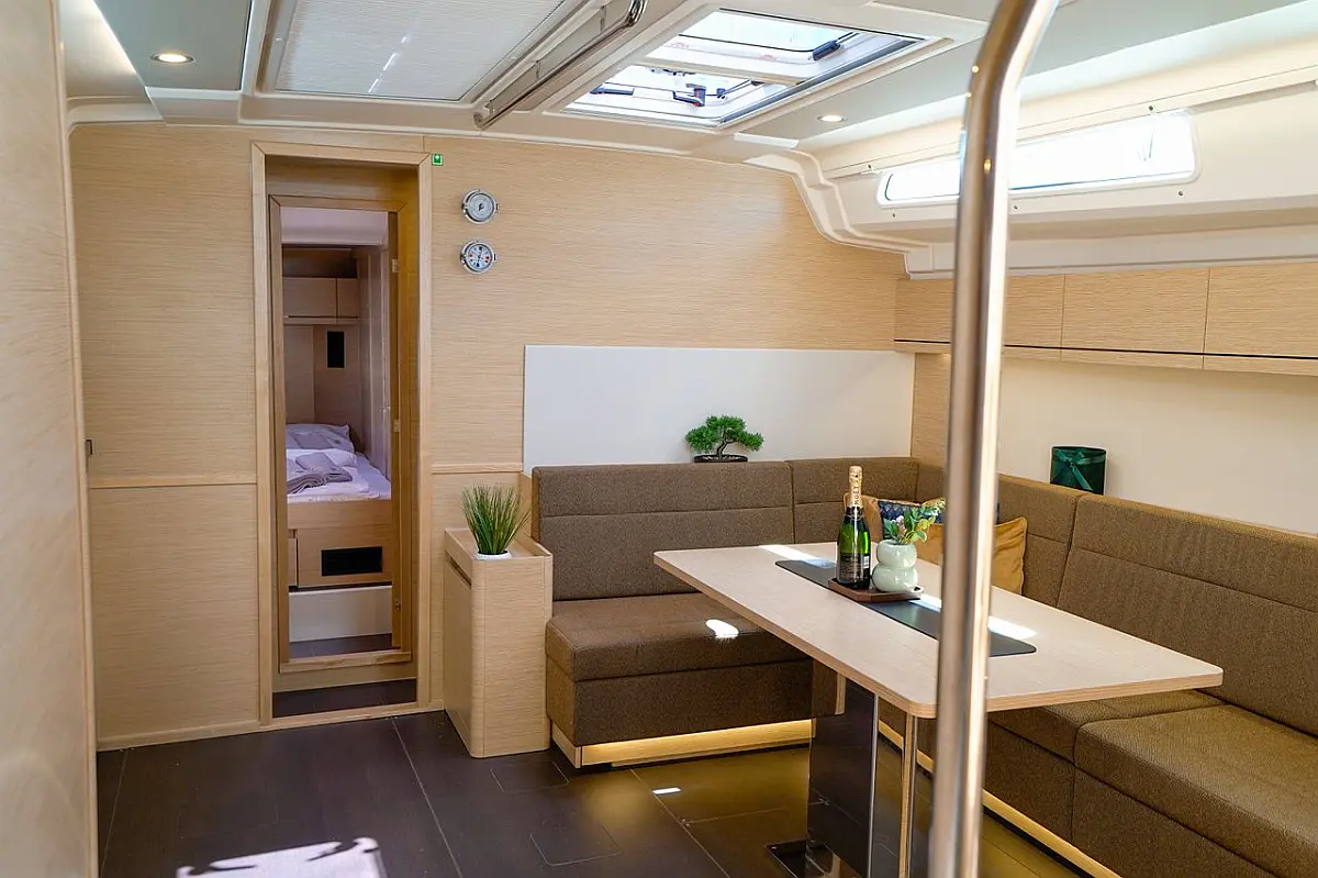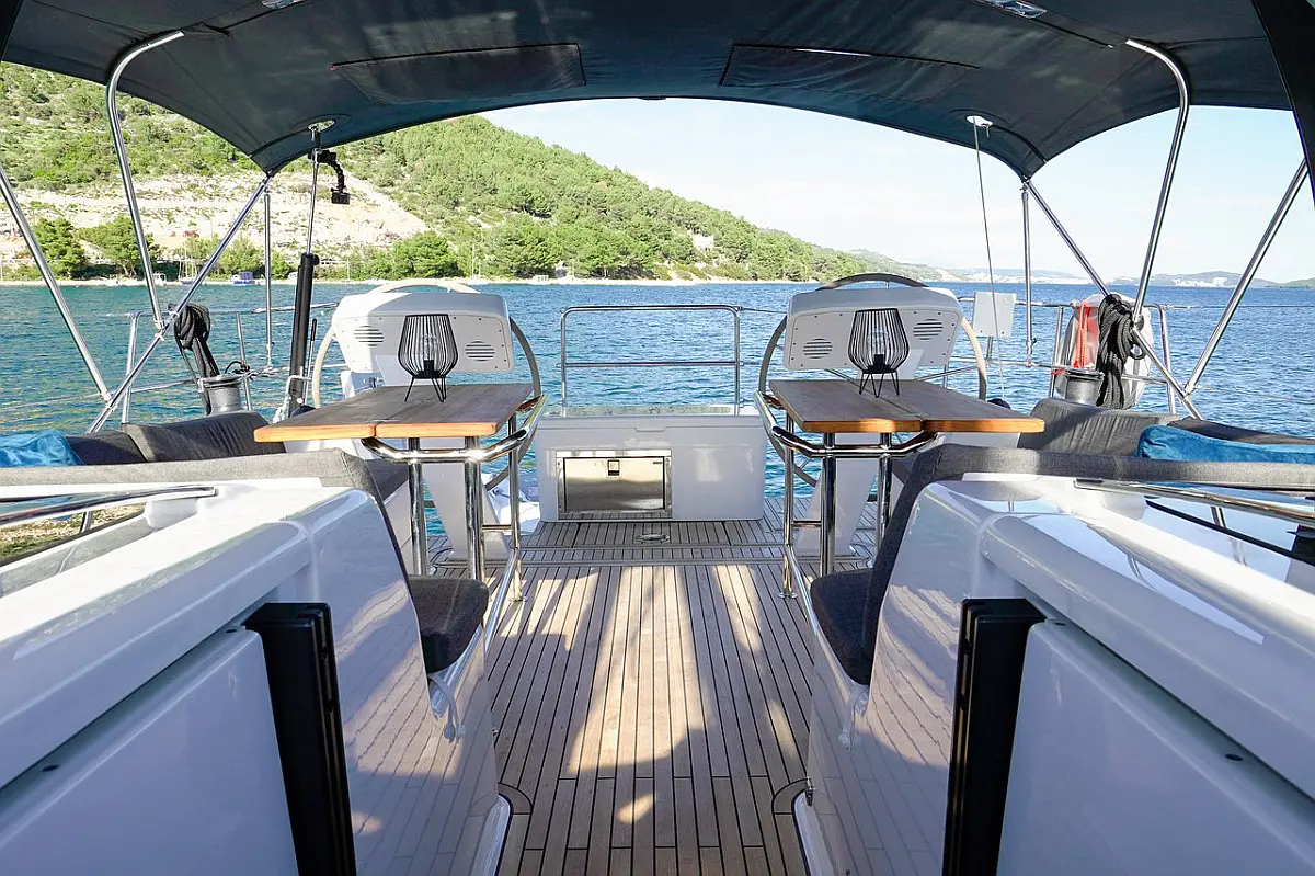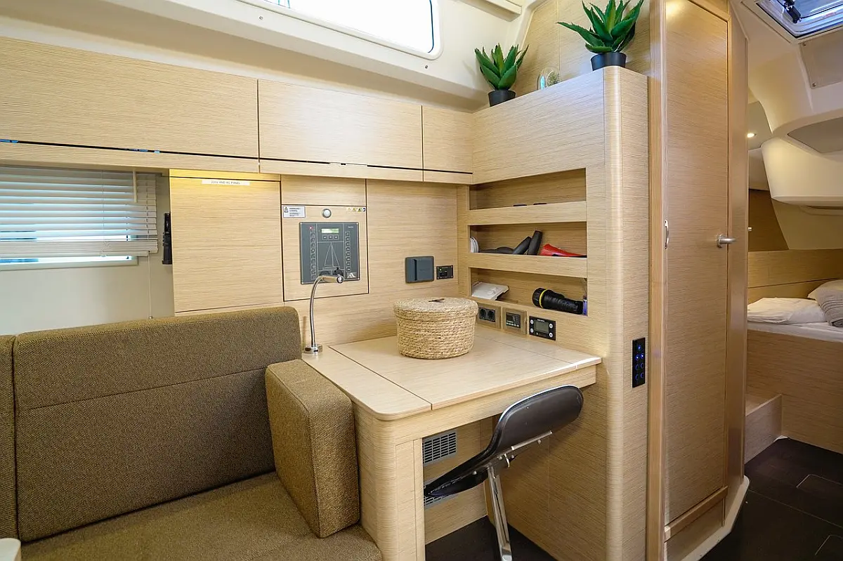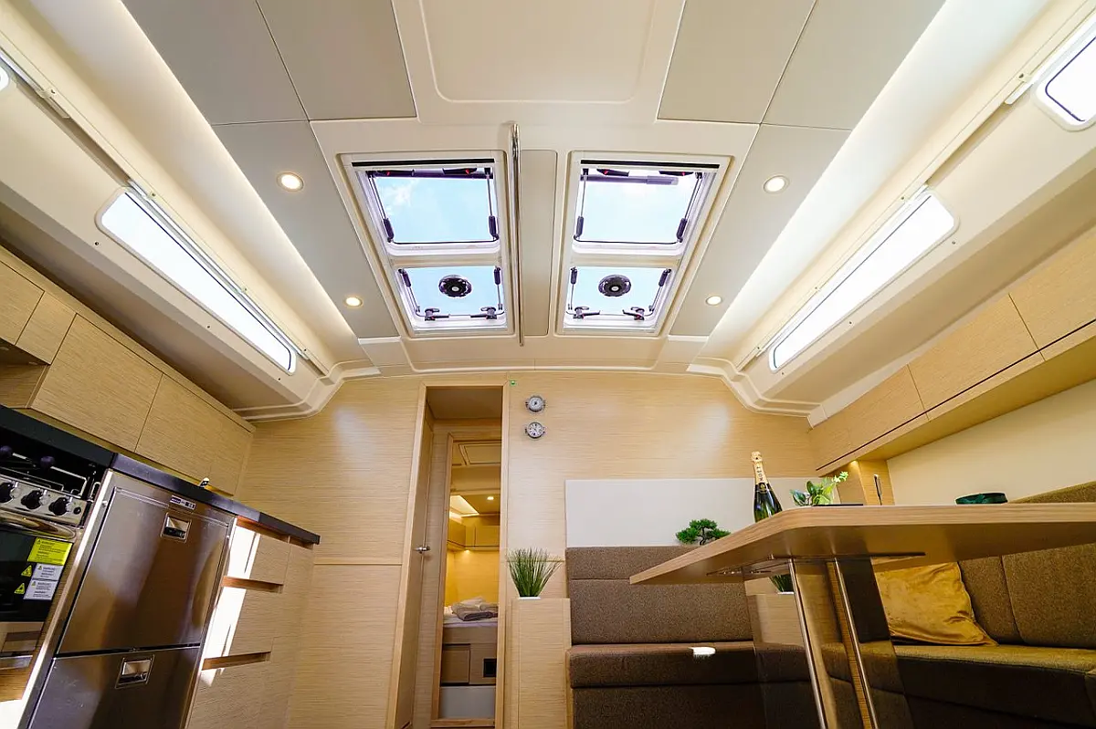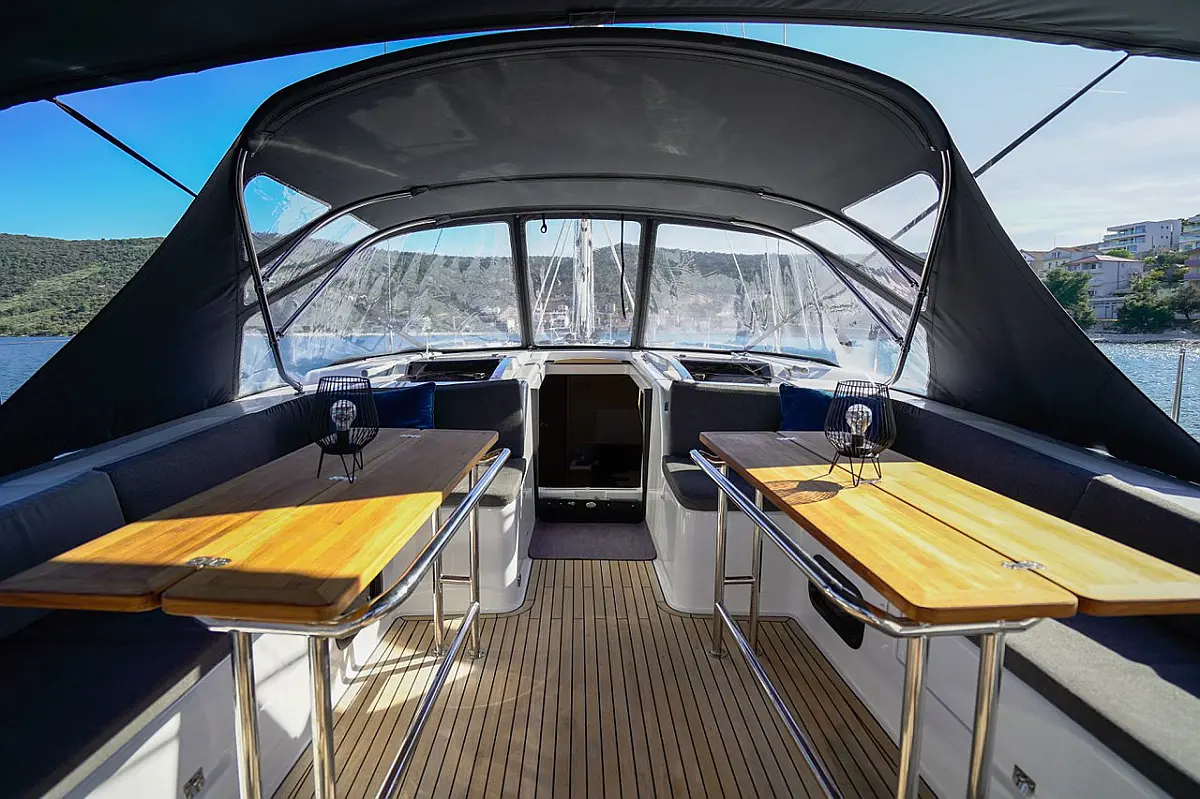Žar v kokpitu, Blazine v kokpitu, Bimini, Pomožni čoln, Sprayhood, Wi-Fi in internet, Hladilnik, Aparat za kavo, Električni wc, Klima, Generator, Inverter, Gretje