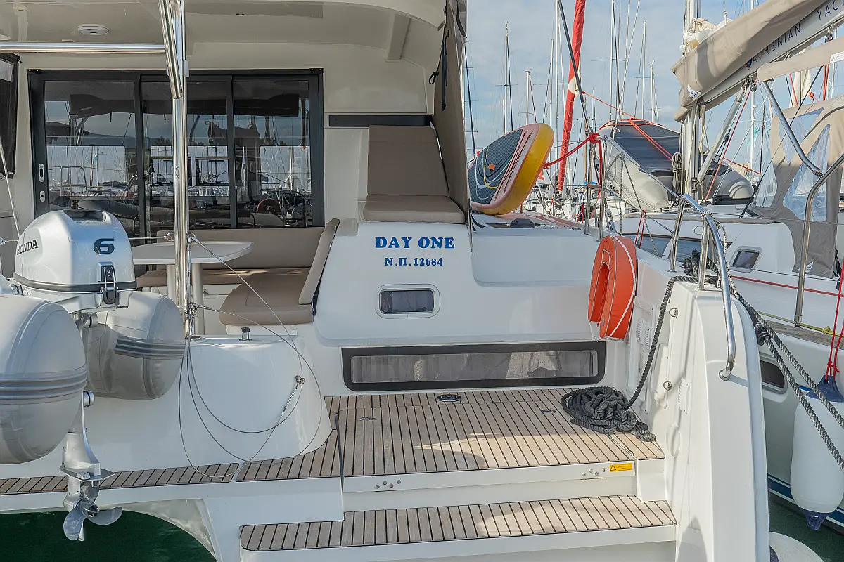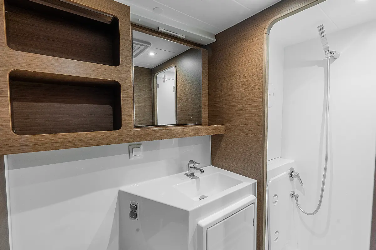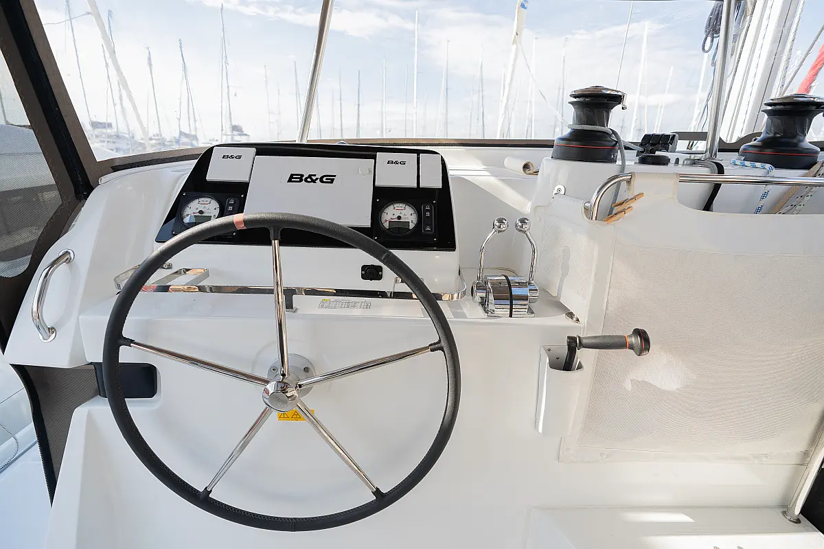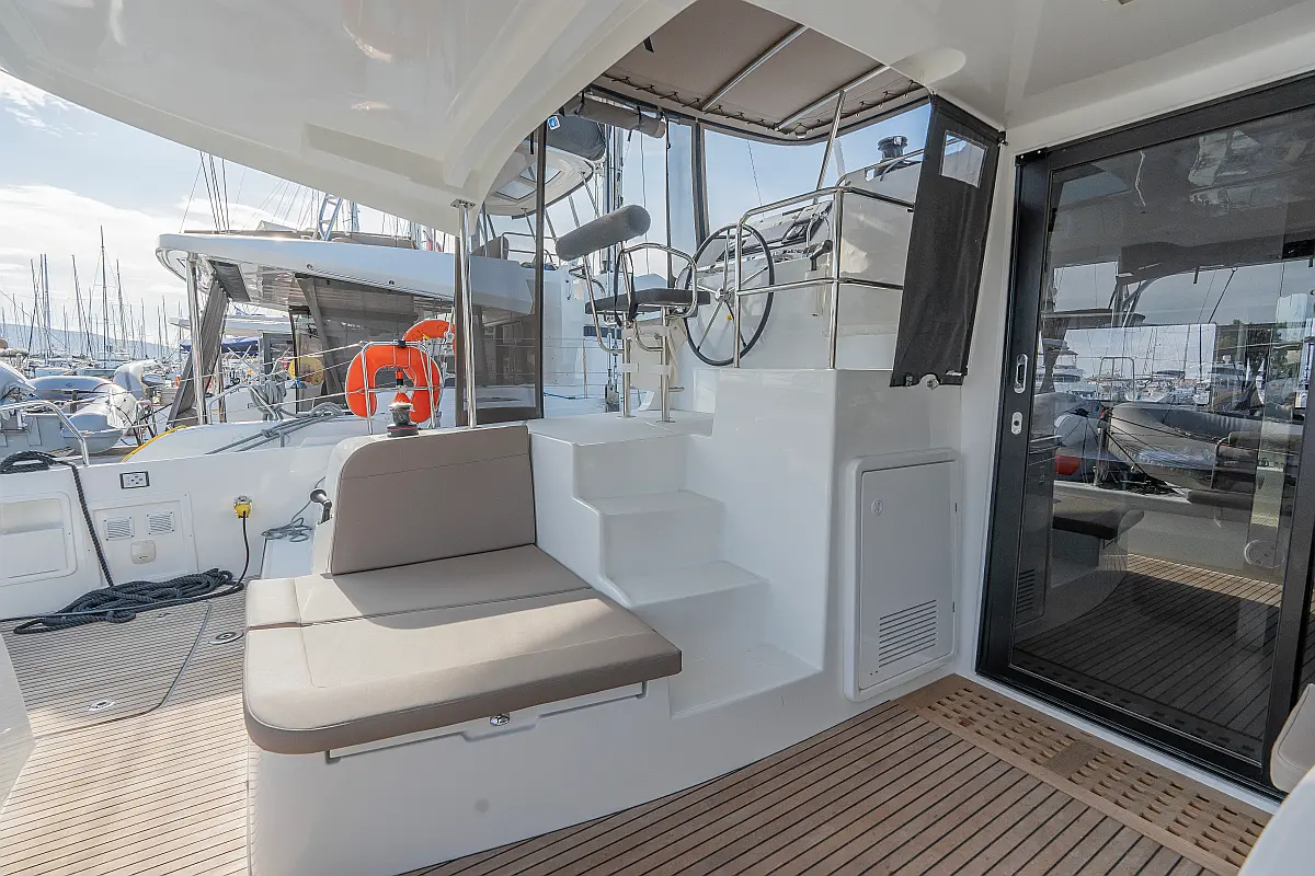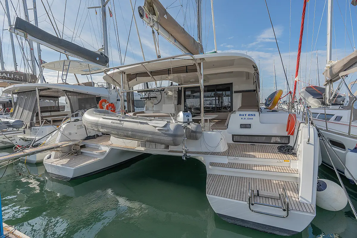 Pomožni čoln, Izvenkrmni motor, Bimini, Blazine v kokpitu, teak kokpit, Klima, Preoblikovalna miza, Hladilnik, Generator, Hidravlična pasarela, Desalinator