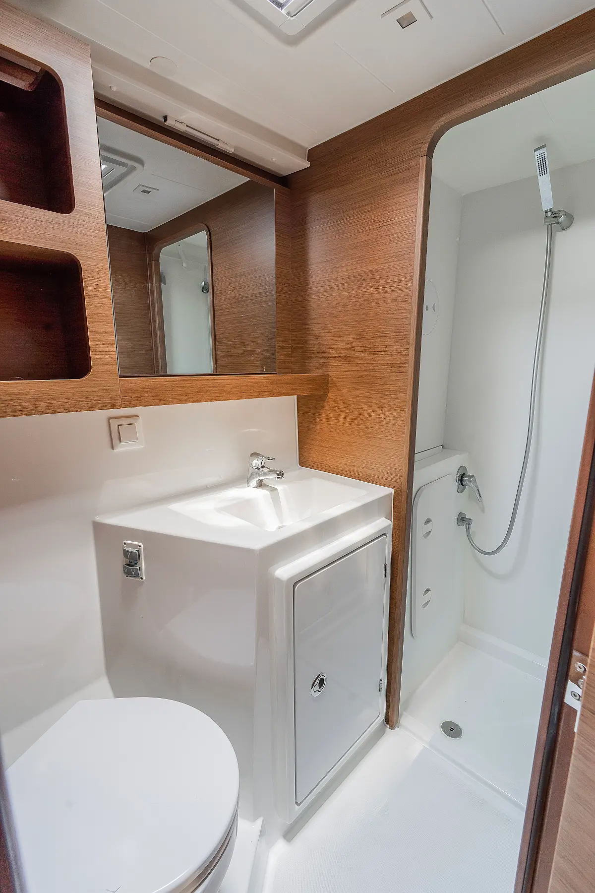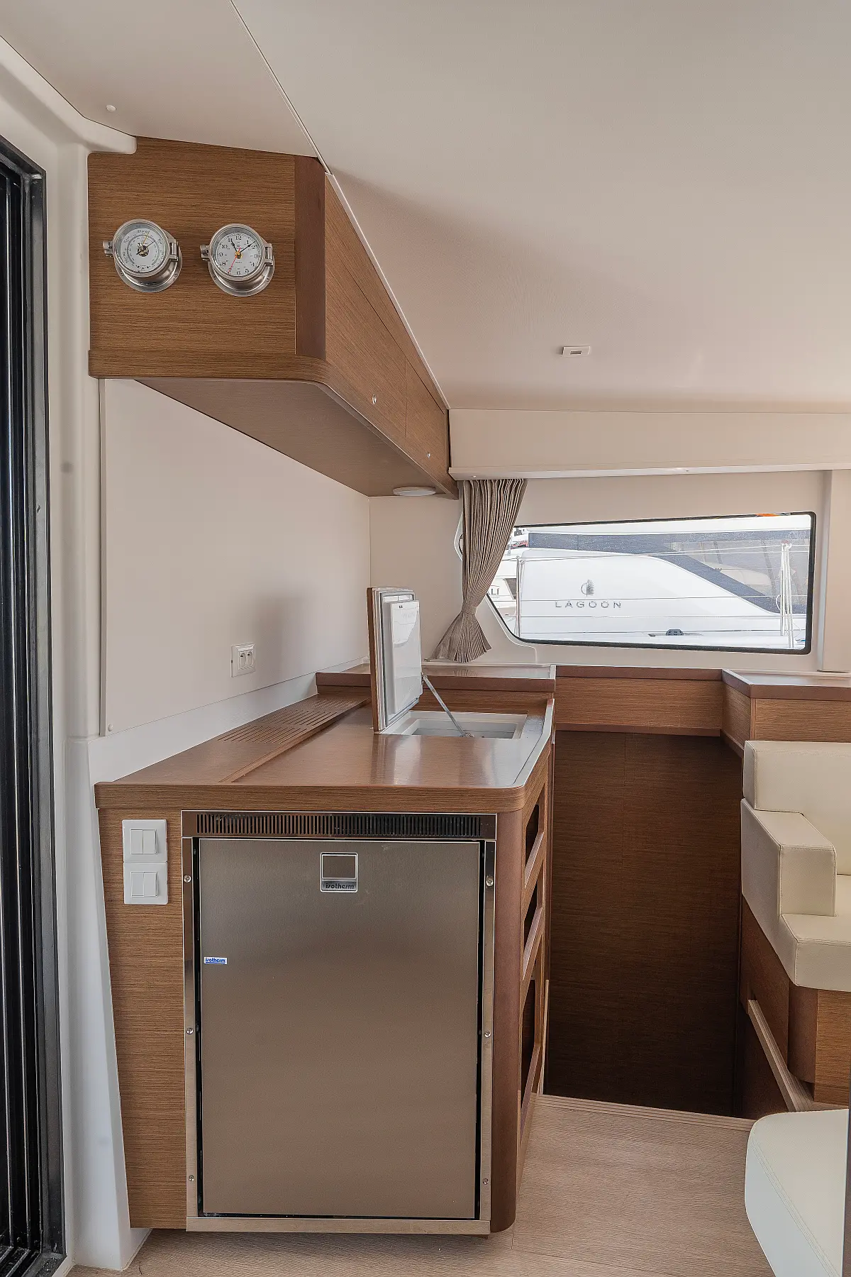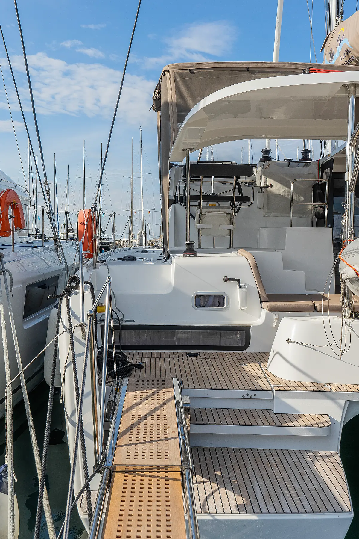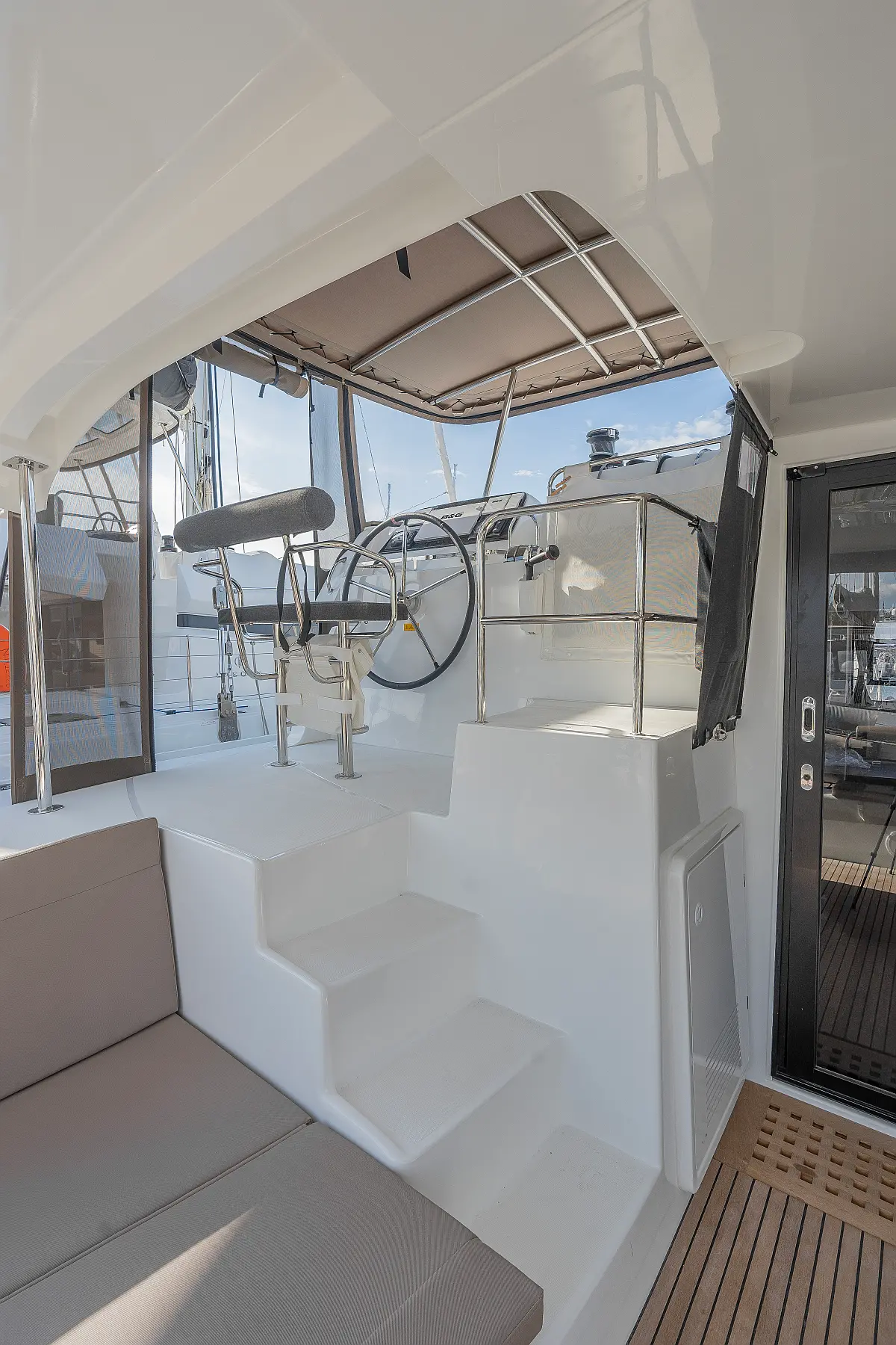 Pomožni čoln, Izvenkrmni motor, Bimini, Blazine v kokpitu, teak kokpit, Klima, Preoblikovalna miza, Hladilnik, Generator, Hidravlična pasarela, Desalinator