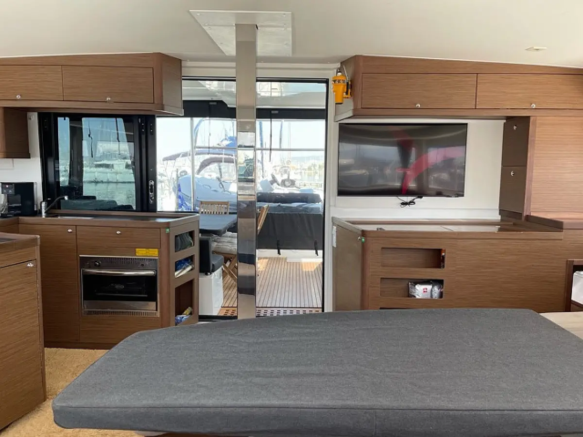 Generator, sončni kolektorji, Teak paluba, Električni wc, Zvočniki v kokpitu, Električni vitli, Hidravlična pasarela, Pomožni čoln, Desalinator, Bimini, Blazine v kokpitu, Hladilnik, Aparat za kavo, Črni tank, Wi-Fi in internet, Klima