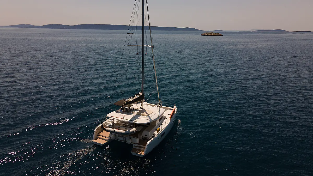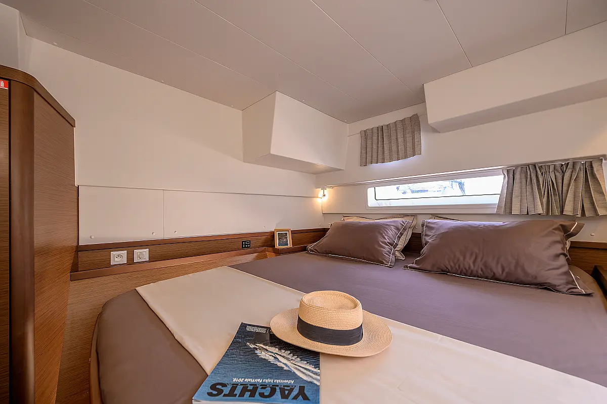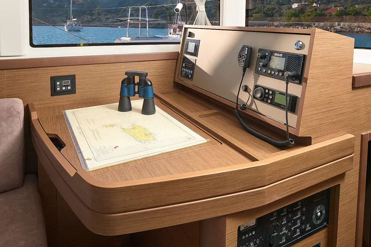 teak kokpit, Izvenkrmni motor, Klima, Hladilnik, Generator, Ledomat, Aparat za kavo, Desalinator, Wi-Fi in internet, Električni wc