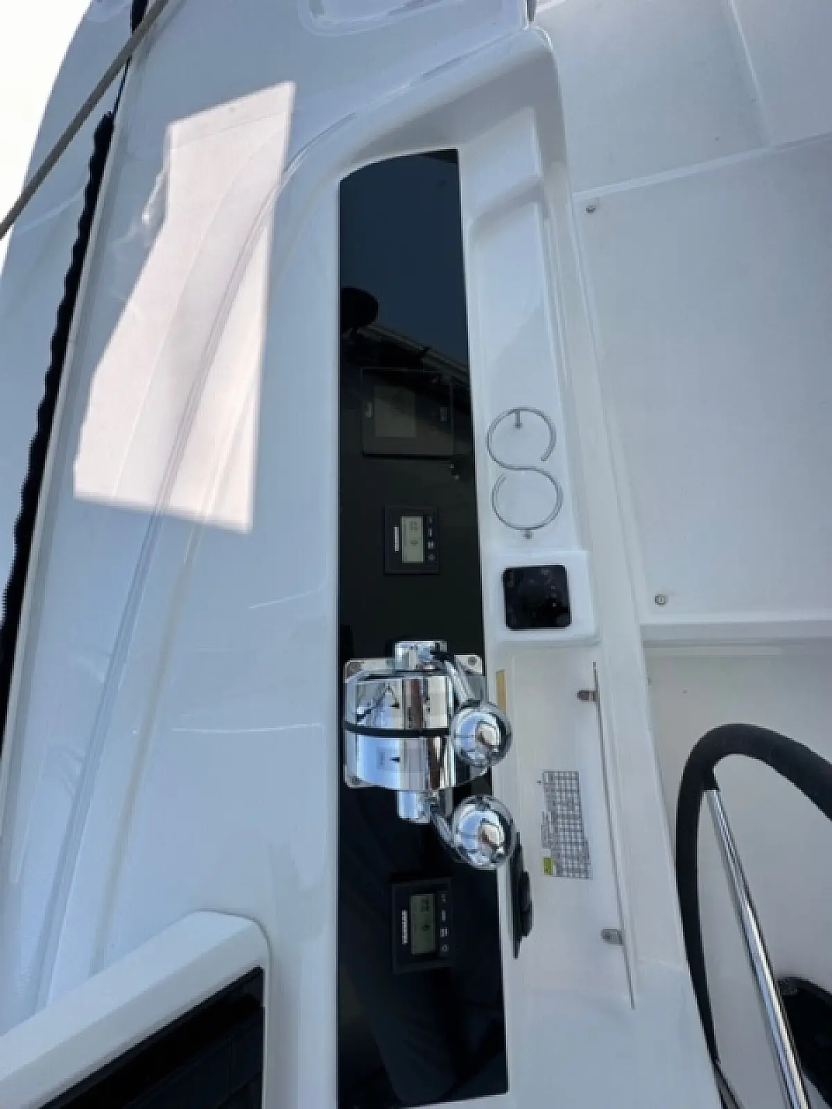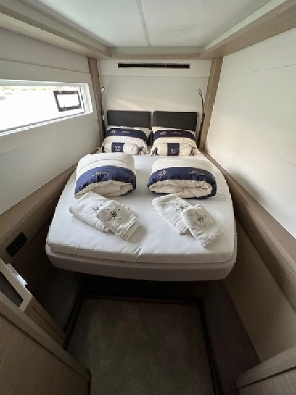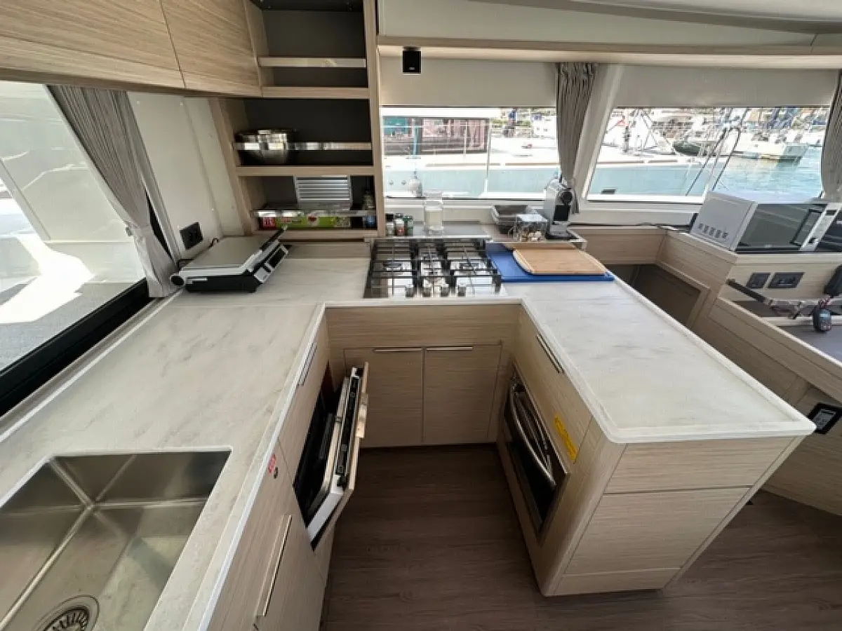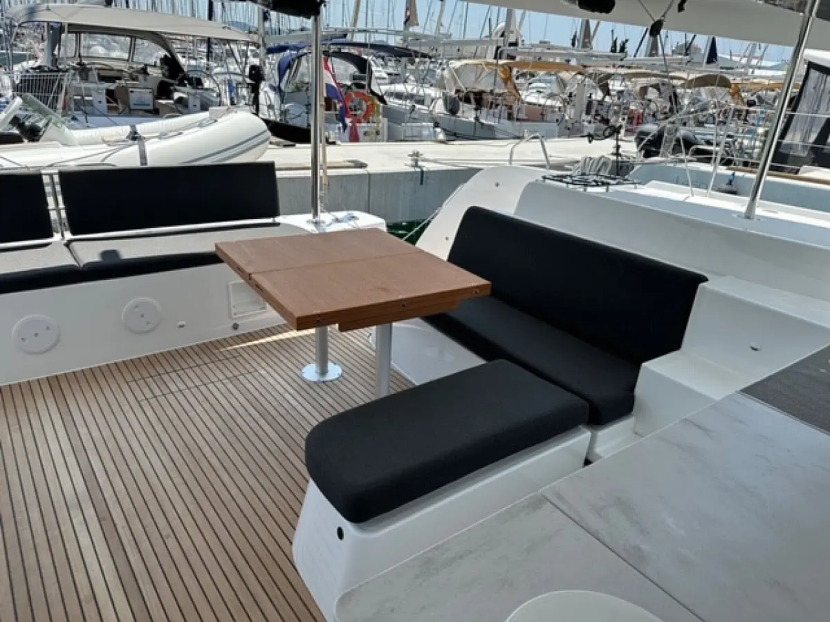 Blazine v kokpitu, teak kokpit, Hladilnik, Klima, Pomožni čoln, Pomivalni stroj, Generator, Ledomat, Aparat za kavo, Električni wc, sončni kolektorji, Desalinator, Gretje