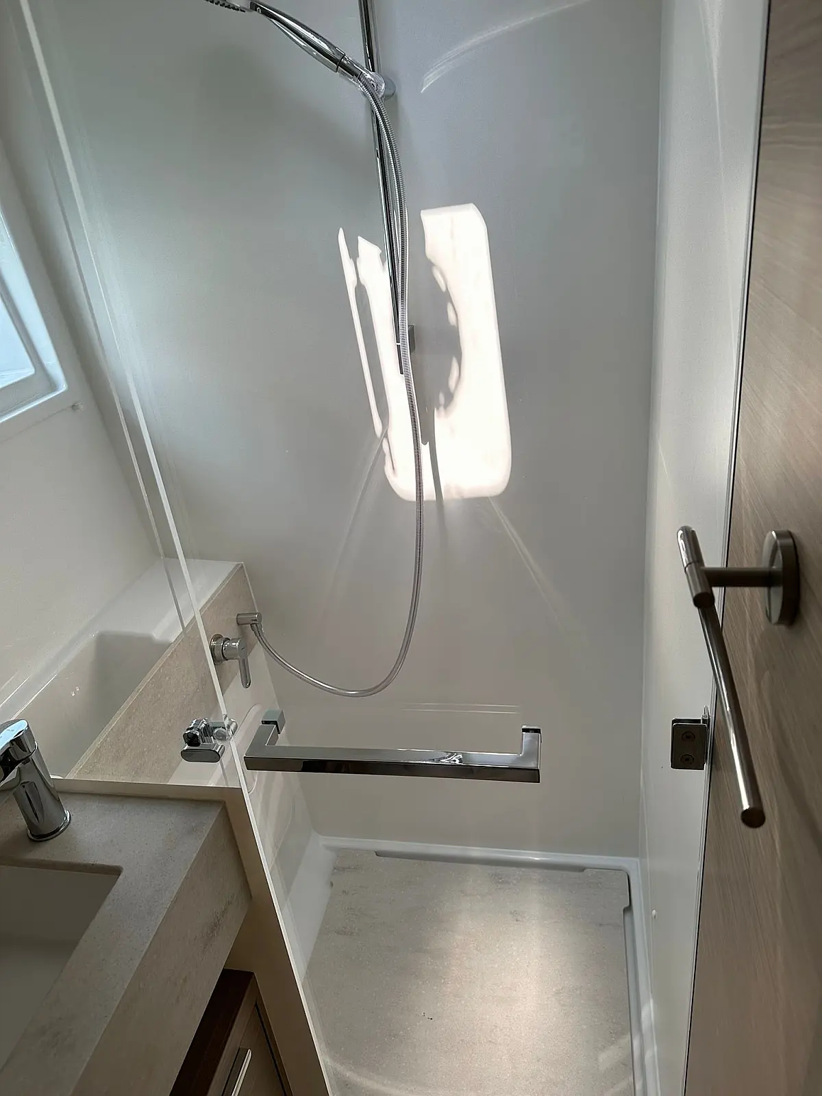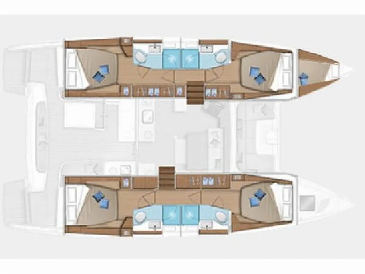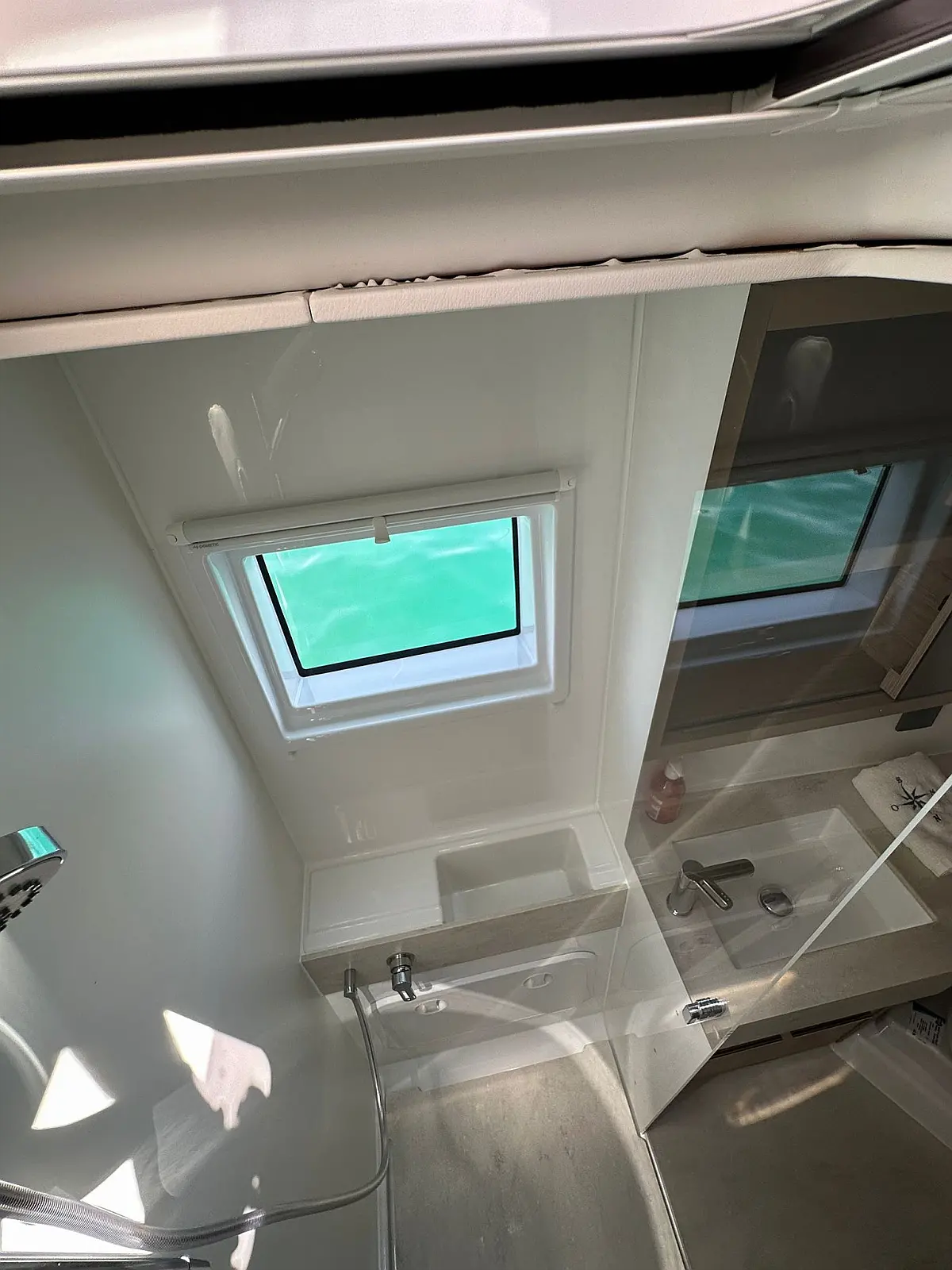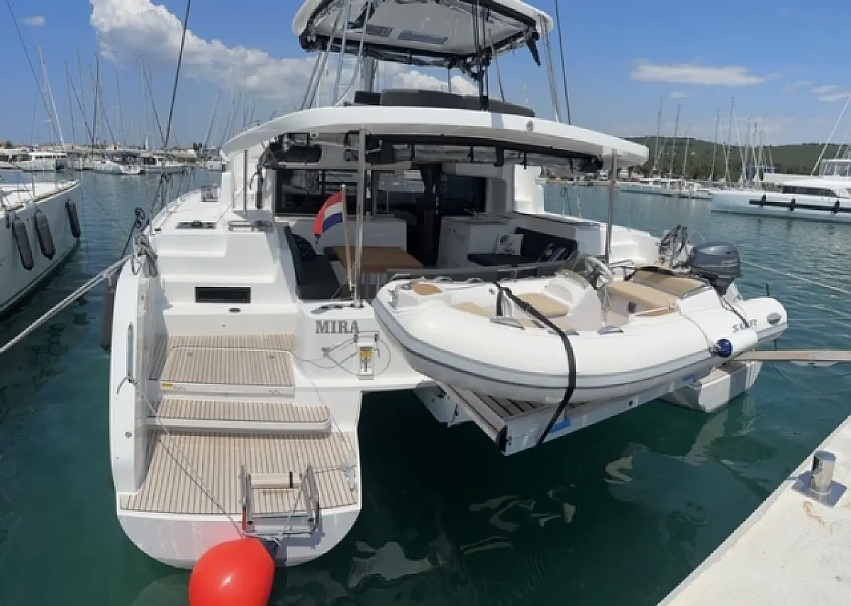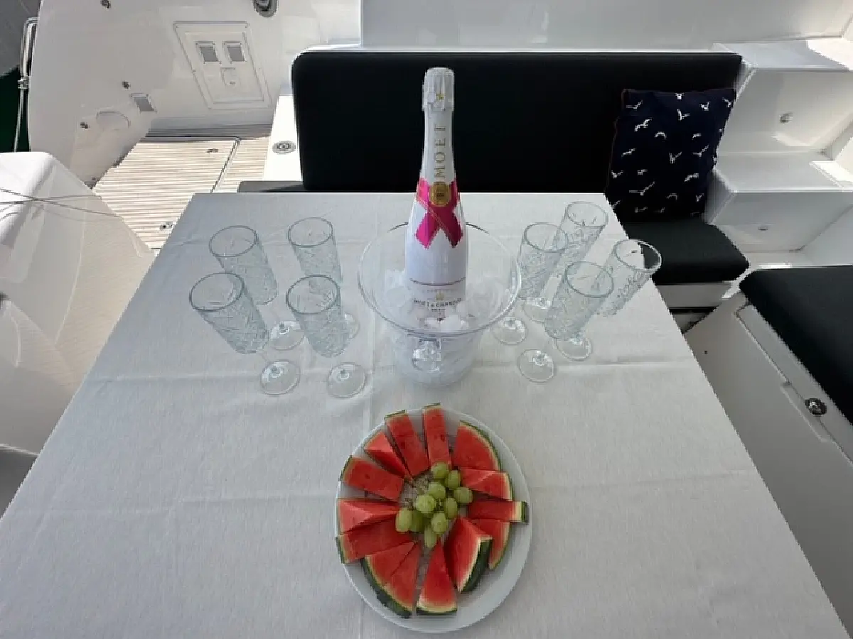 Blazine v kokpitu, teak kokpit, Hladilnik, Klima, Pomožni čoln, Pomivalni stroj, Generator, Ledomat, Aparat za kavo, Električni wc, sončni kolektorji, Desalinator, Gretje