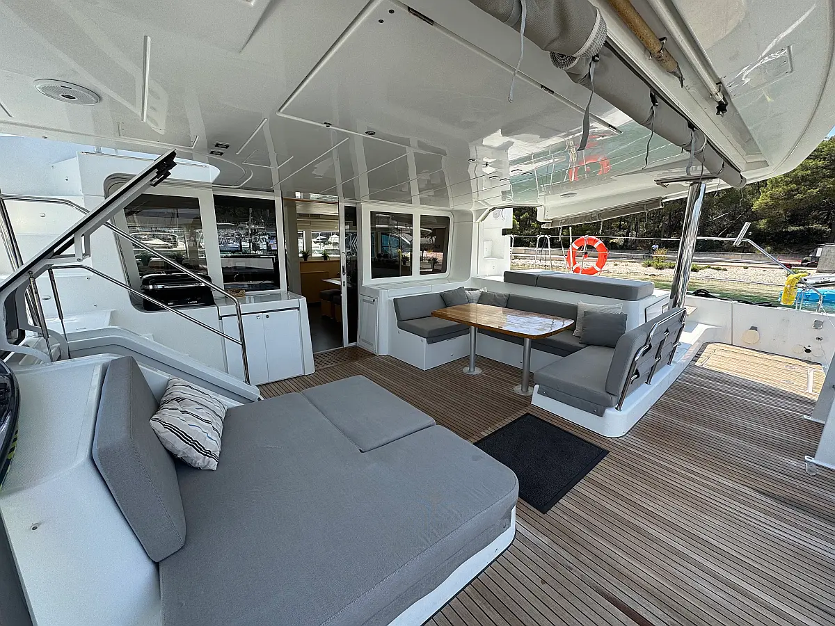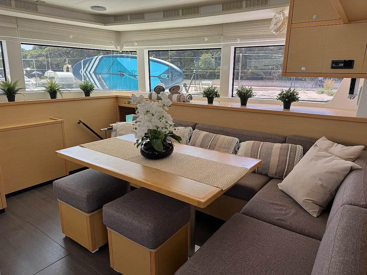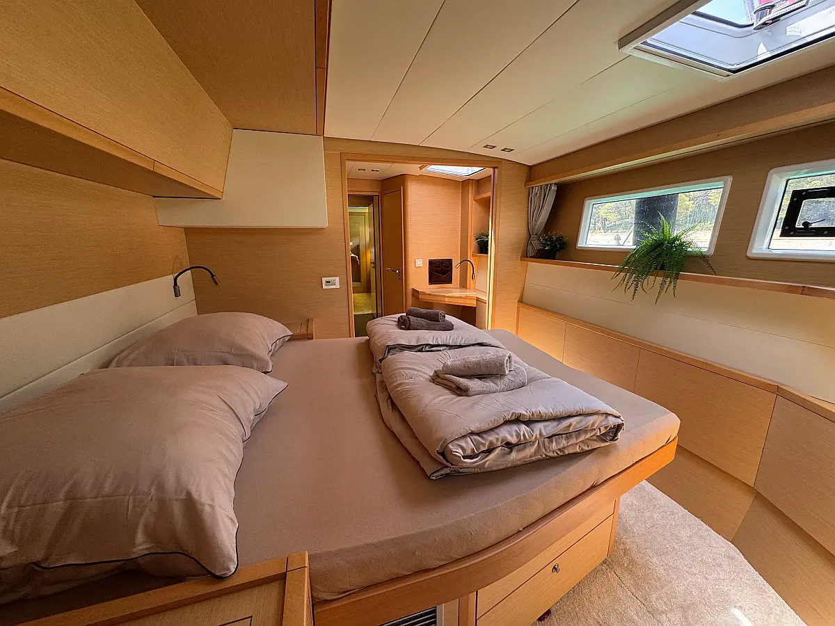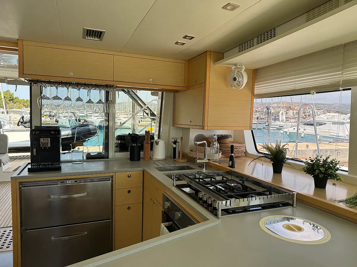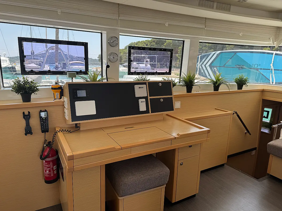 Desalinator, Generator, Klima, Električni wc, Inverter, Električni vitli, Bimini, teak kokpit, Pomožni čoln, Blazine v kokpitu, Aparat za kavo