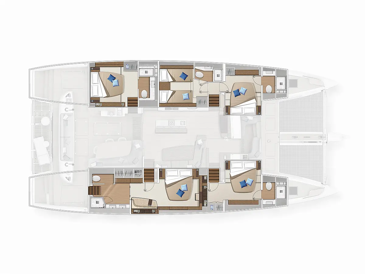 20.55 m dolga Katamaran Lagoon Sixty 5 Owner's Version, ​​izdelana leta 2026, je idealna jahta za raziskovanje Italija. S 5 (4 double cabins + 1 owner's cabin + 2 crew) udobnimi kabinami, 5 WC/Tuš in dovolj ležišč za do 10 + 4 crew gostov zagotavlja dovolj prostora za sprostitev in zabavo. Ta jahta je na voljo za najem.