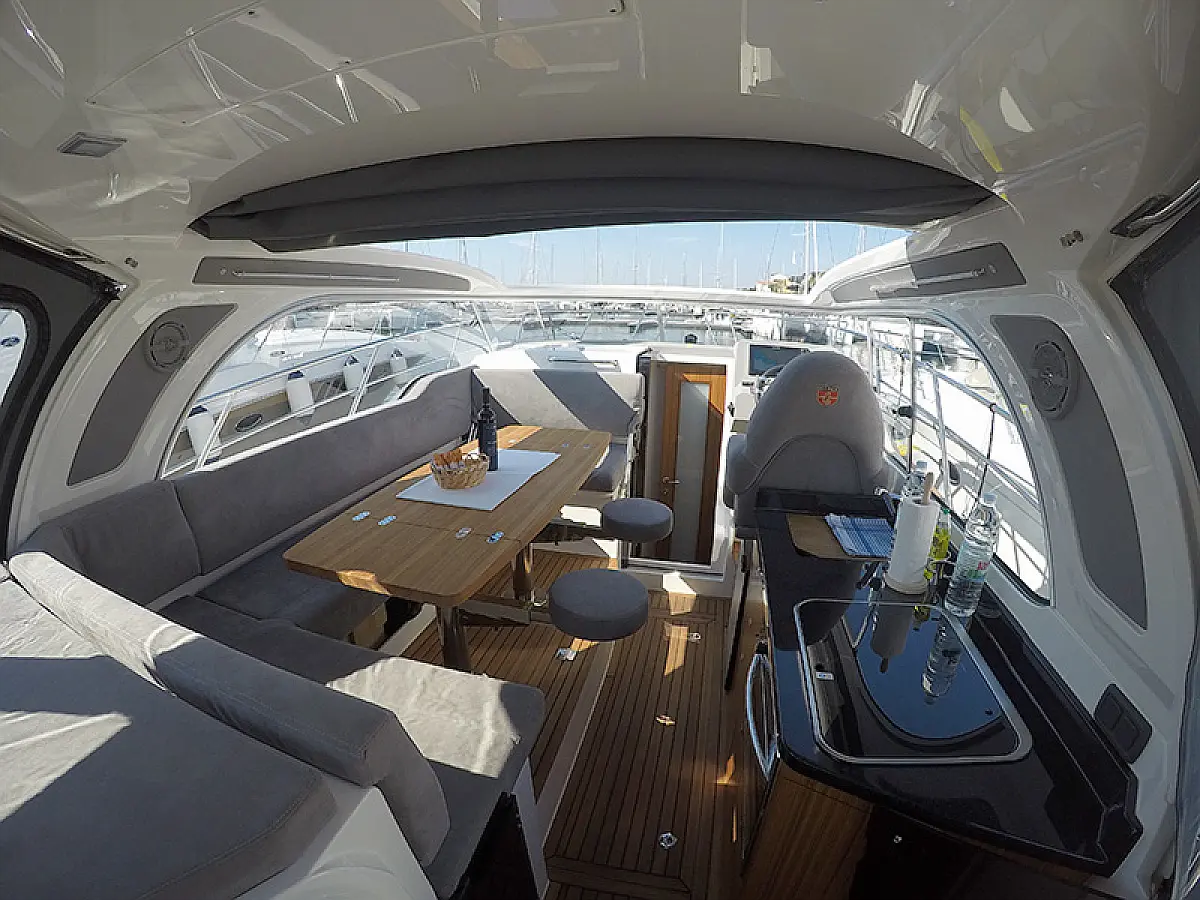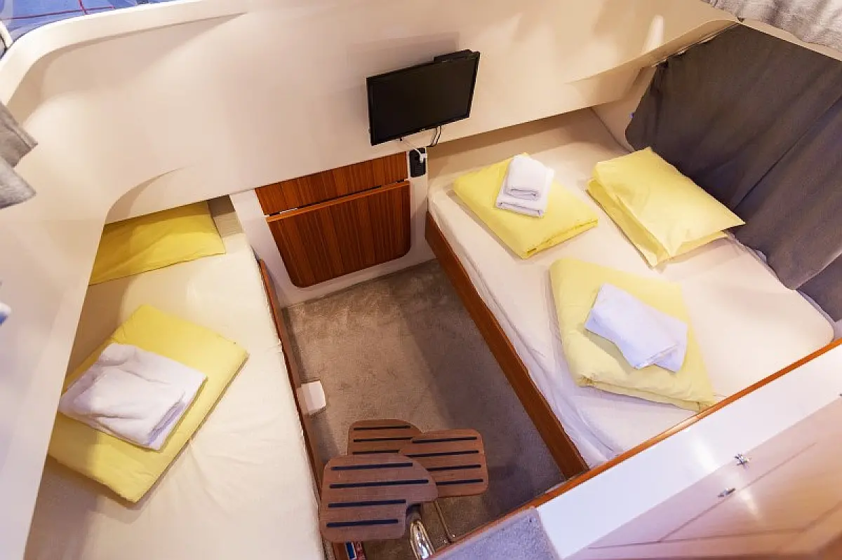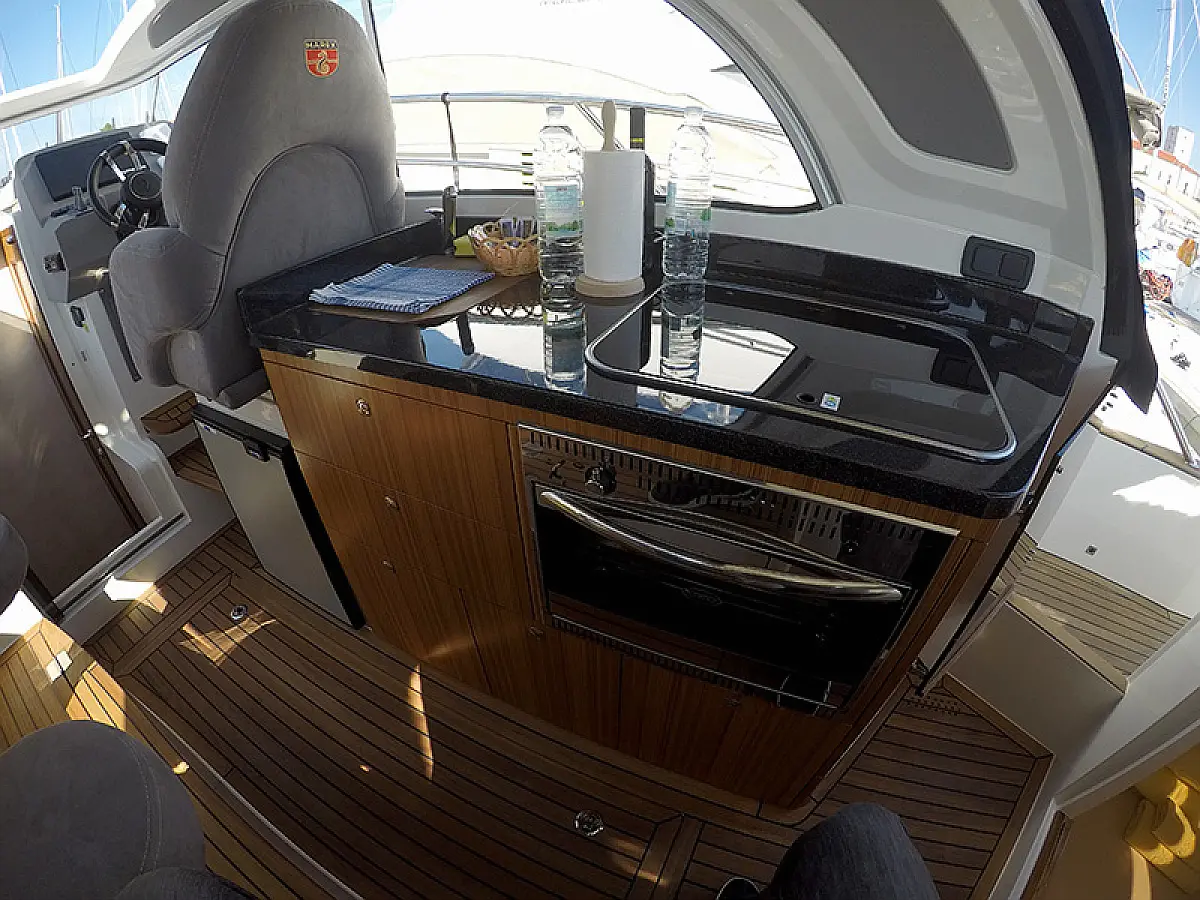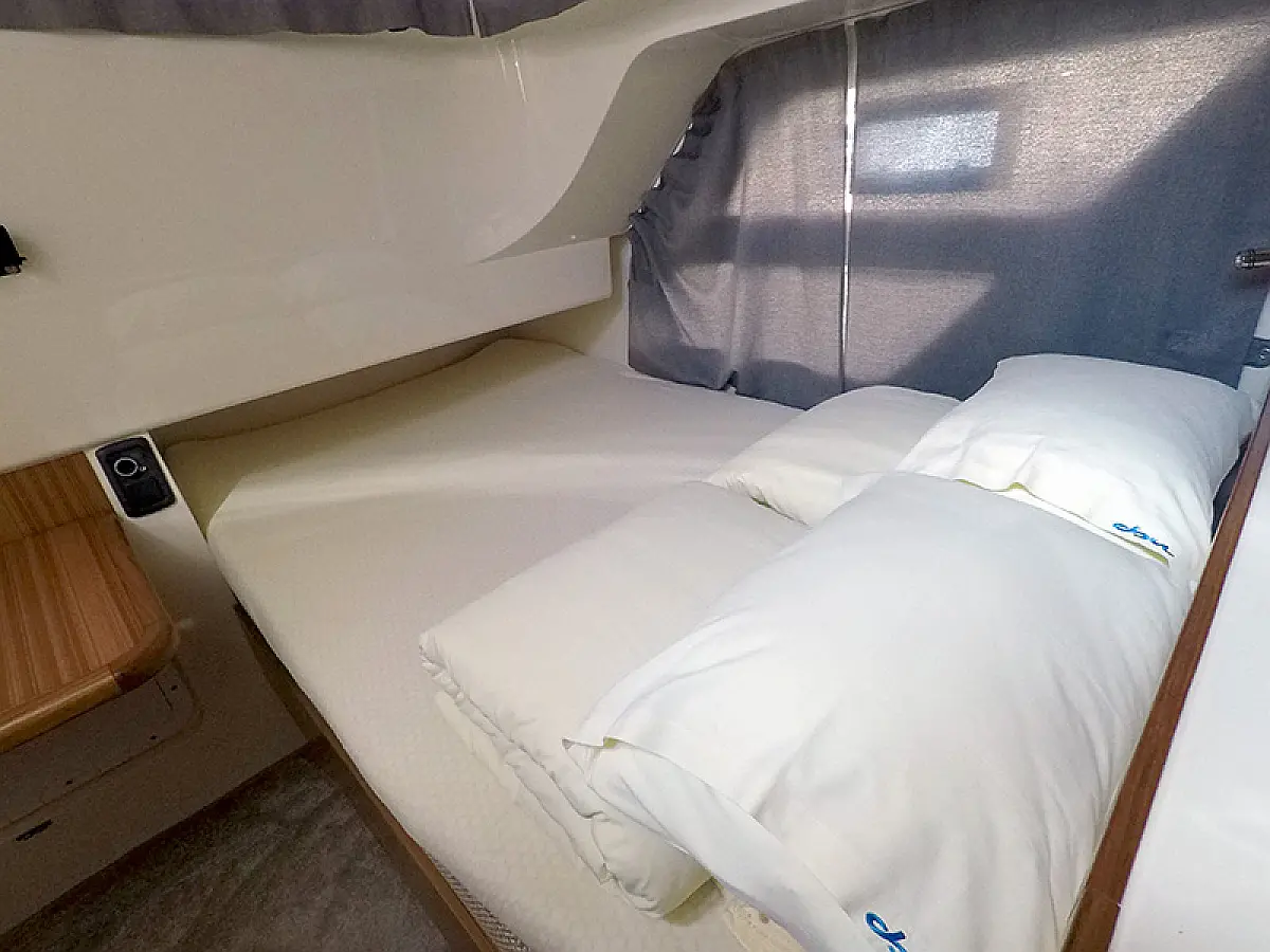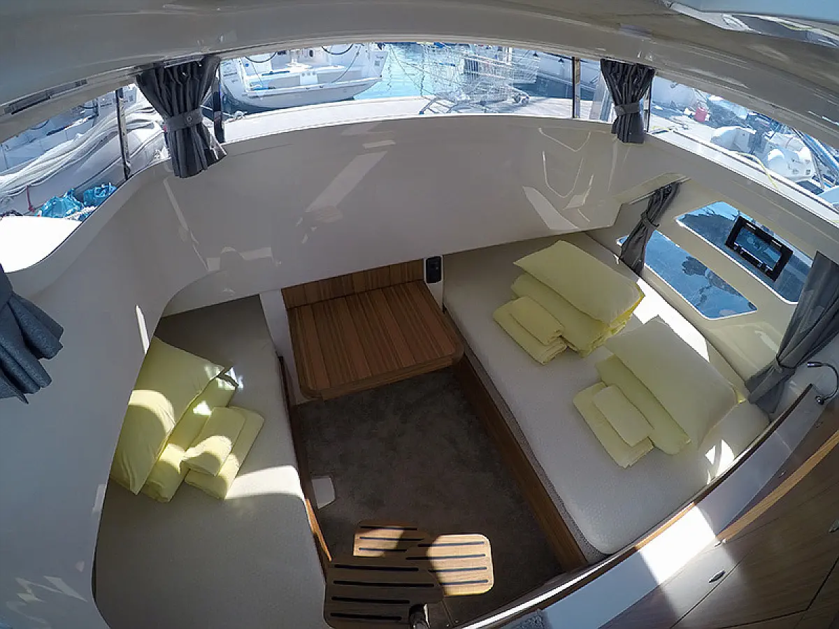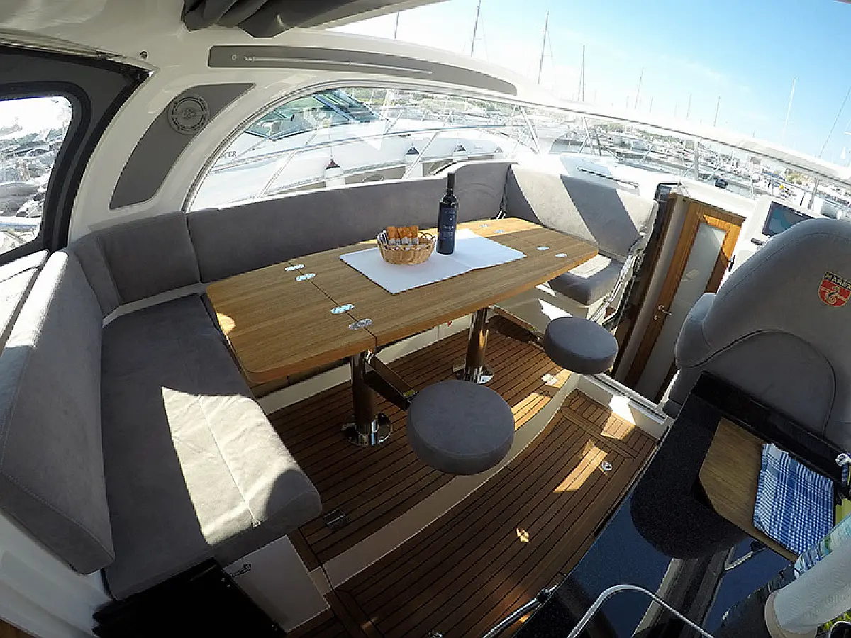 Marex 320 Aft Cabin Cruiser has many of the same solutions as the successful multi award winning Marex 370 Aft Cabin Cruiser and kept the neat aft-cabin design. It is a family boat, that was designed to suit the needs of both – a small and large families with ingenious functionality and have the most important needs for a family when they spend a longer holiday on the water: High spaciousness headroom, big beds, spacious washrooms with shower facilities, a large seating area with connecting galley and a wide side deck walkway. The smart canopy solution is very easy to operate. Marex 320 ACC is family’s summer house.