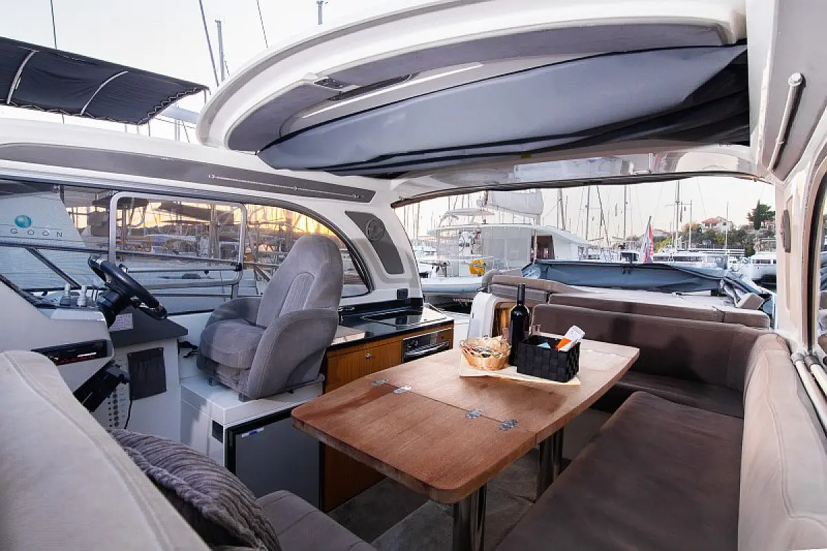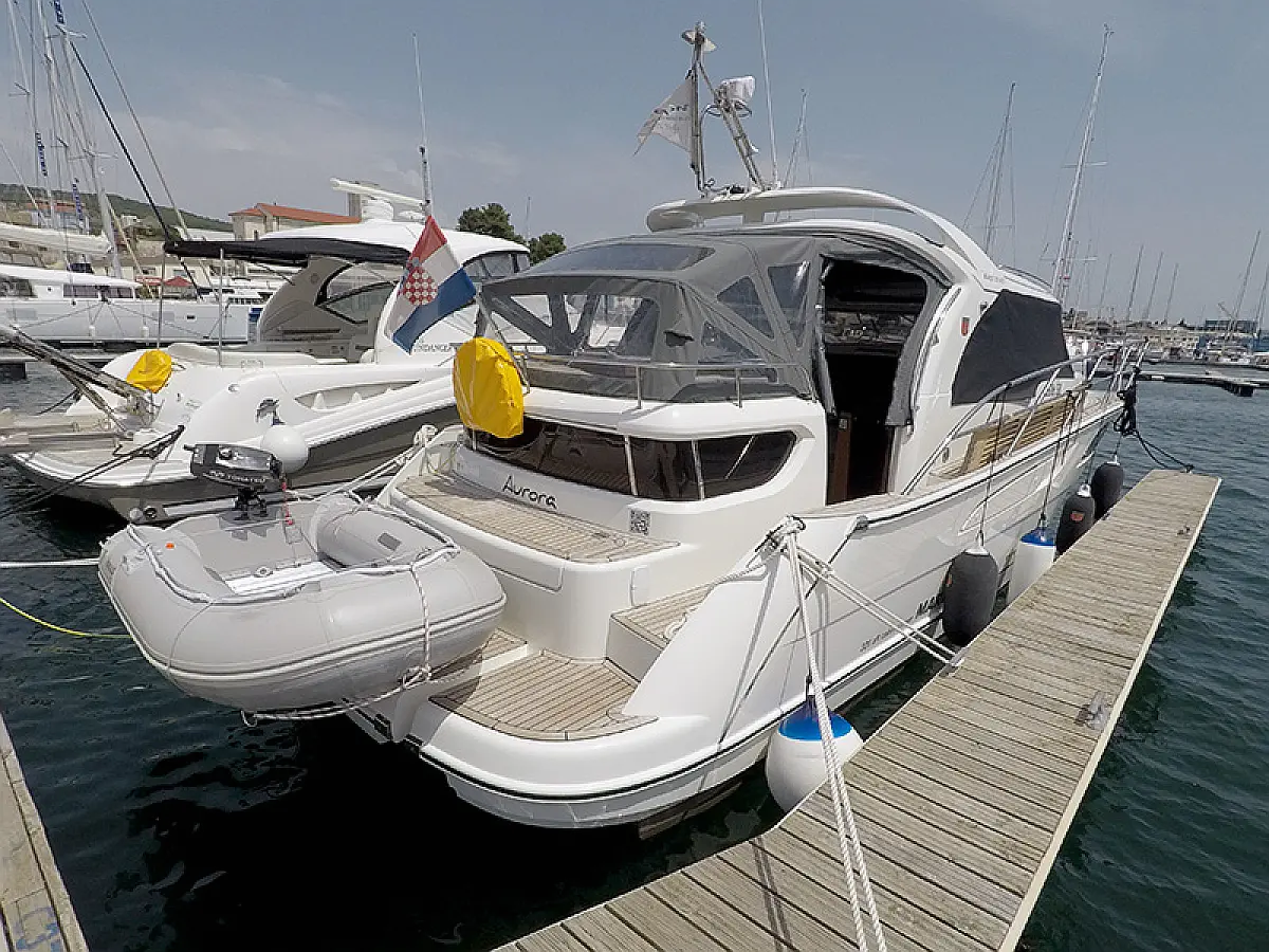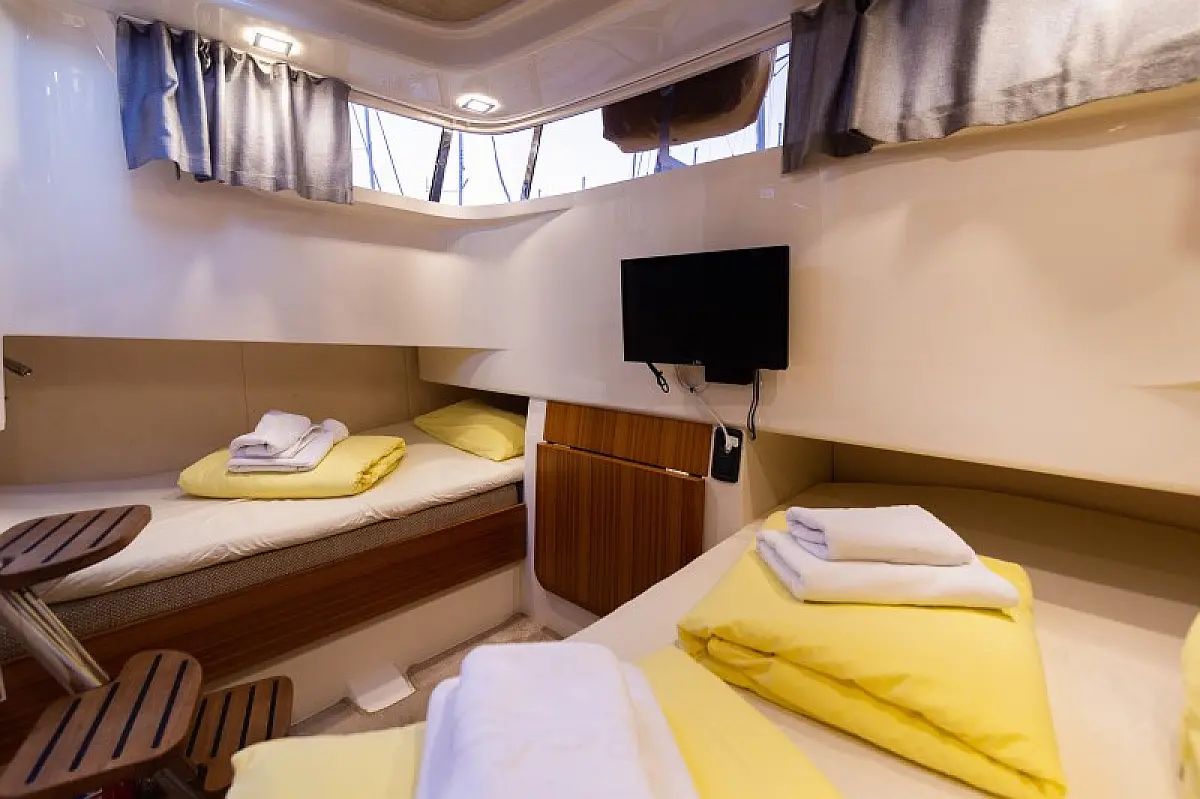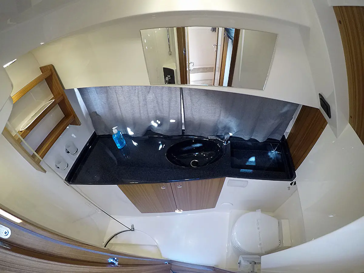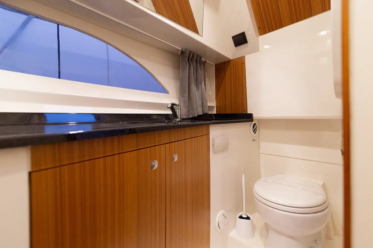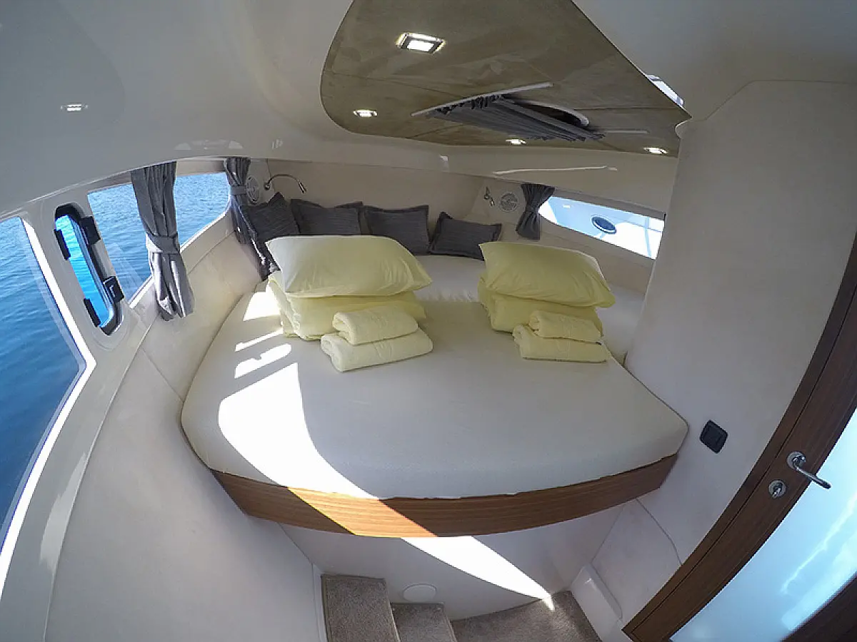 Marex 320 Aft Cabin Cruiser has many of the same solutions as the successful multi award winning Marex 370 Aft Cabin Cruiser and kept the neat aft-cabin design. It is a family boat, that was designed to suit the needs of both – a small and large families with ingenious functionality and have the most important needs for a family when they spend a longer holiday on the water: High spaciousness headroom, big beds, spacious washrooms with shower facilities, a large seating area with connecting galley and a wide side deck walkway. The smart canopy solution is very easy to operate. Marex 320 ACC is family’s summer house.