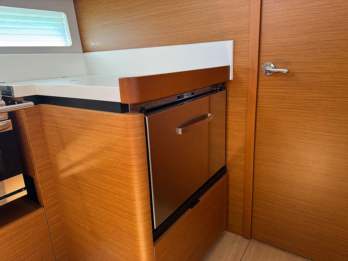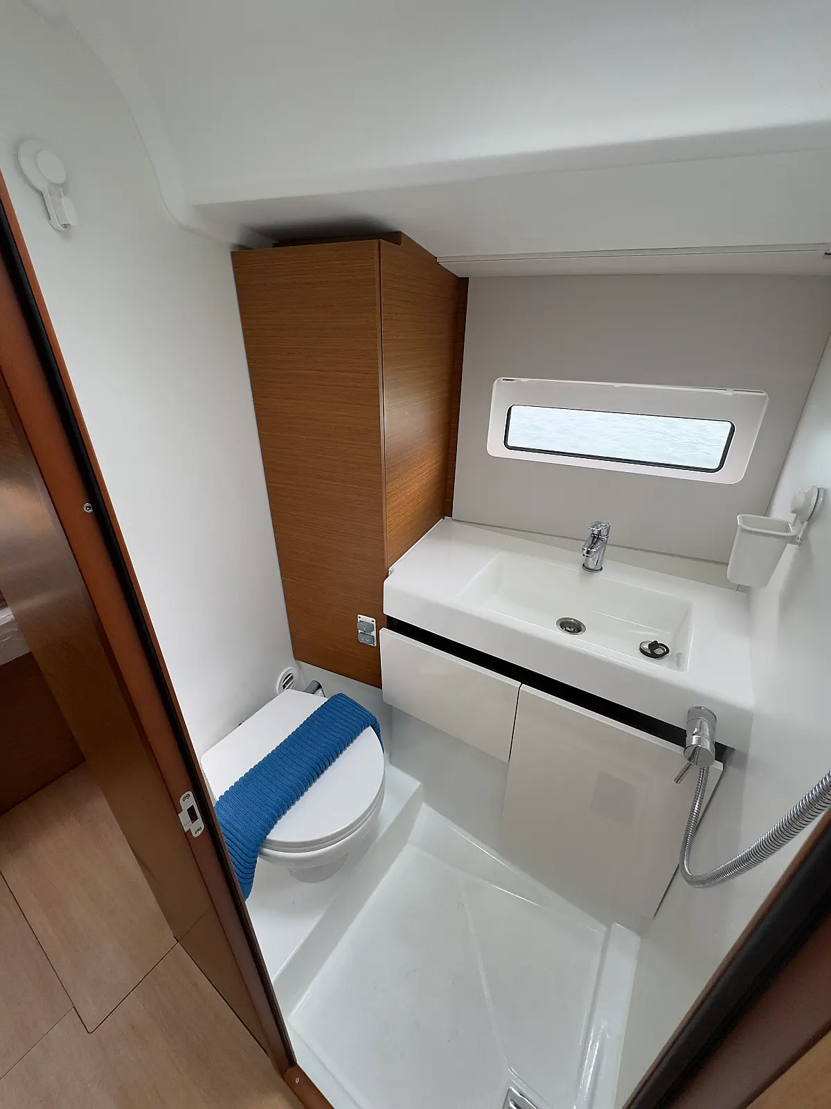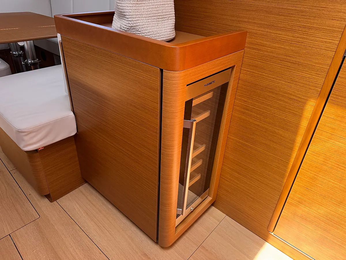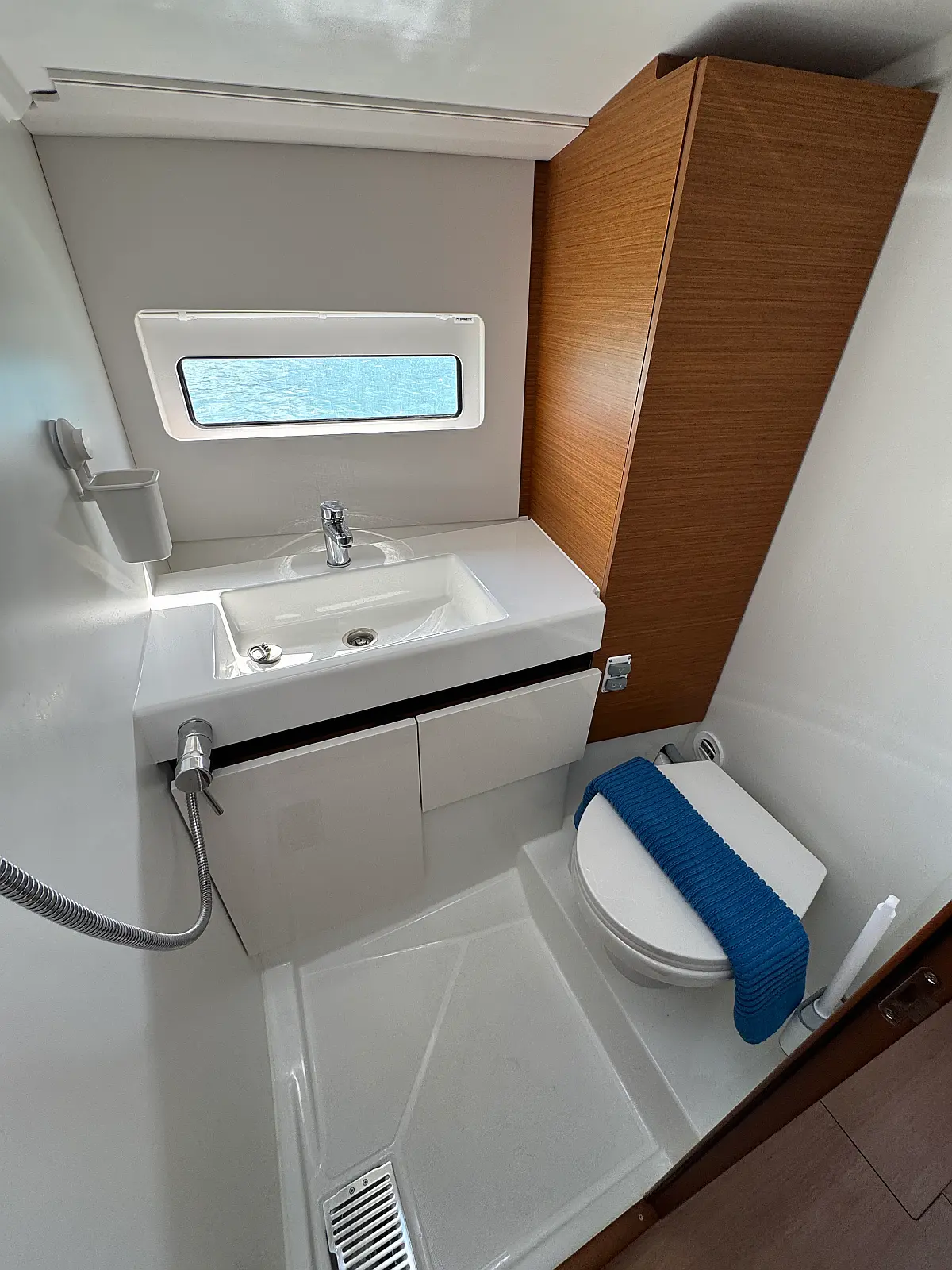 Pomožni čoln, Zvočniki v kokpitu, Sprayhood, Bimini, Blazine v kokpitu, Hladilnik, teak kokpit, Wi-Fi in internet, Klima, Generator, Črni tank, Električni wc, Desalinator