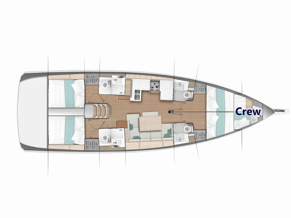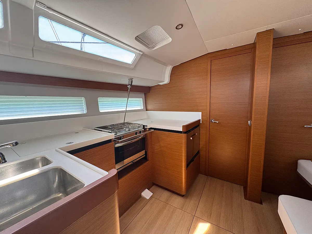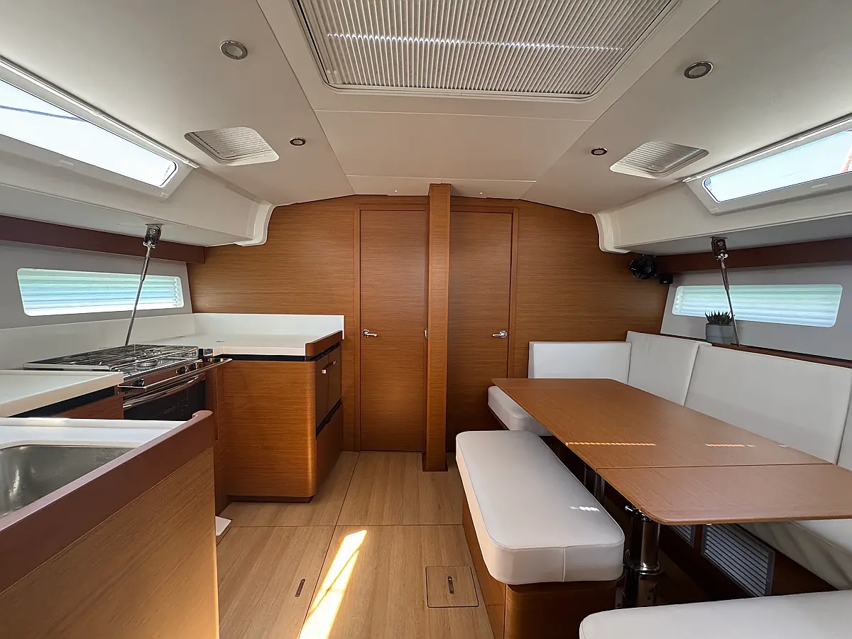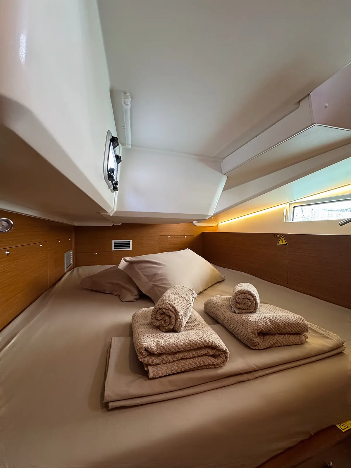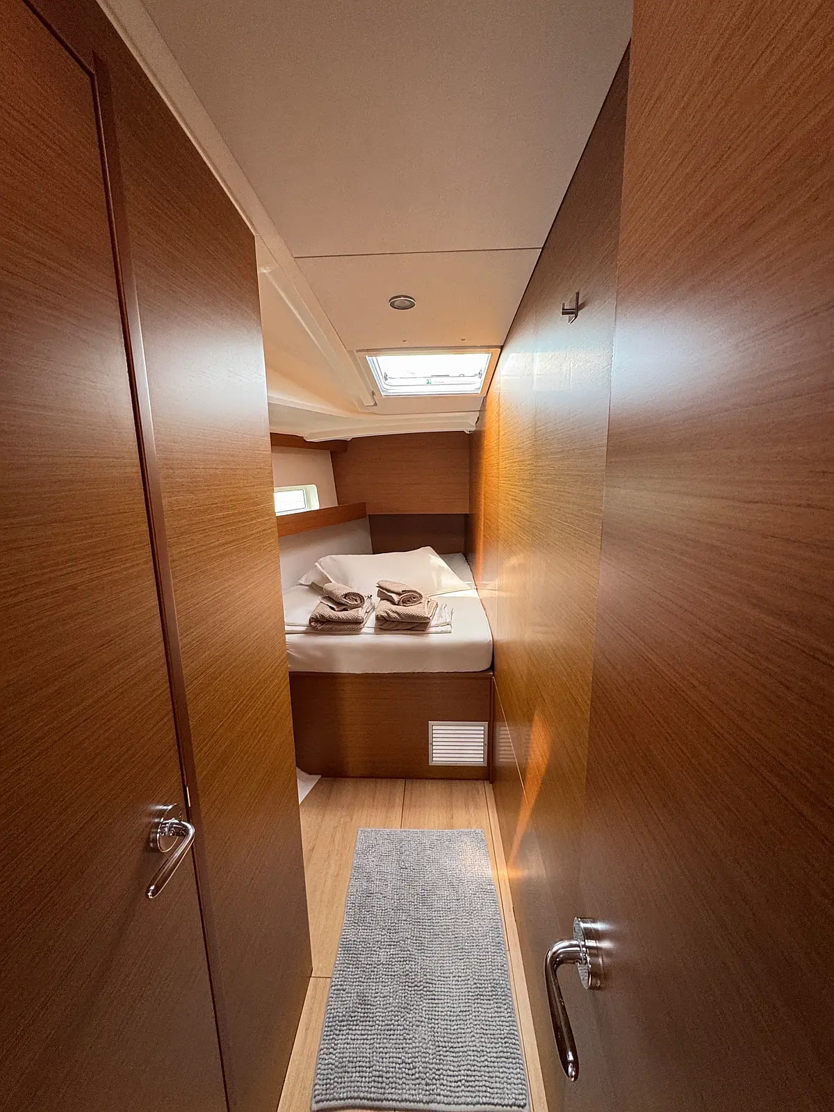 Pomožni čoln, Zvočniki v kokpitu, Sprayhood, Bimini, Blazine v kokpitu, Hladilnik, teak kokpit, Wi-Fi in internet, Klima, Generator, Črni tank, Električni wc, Desalinator