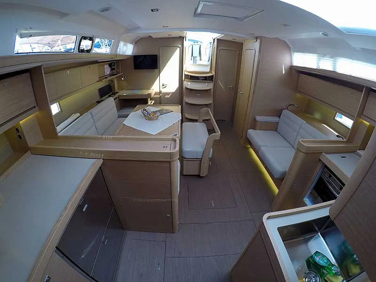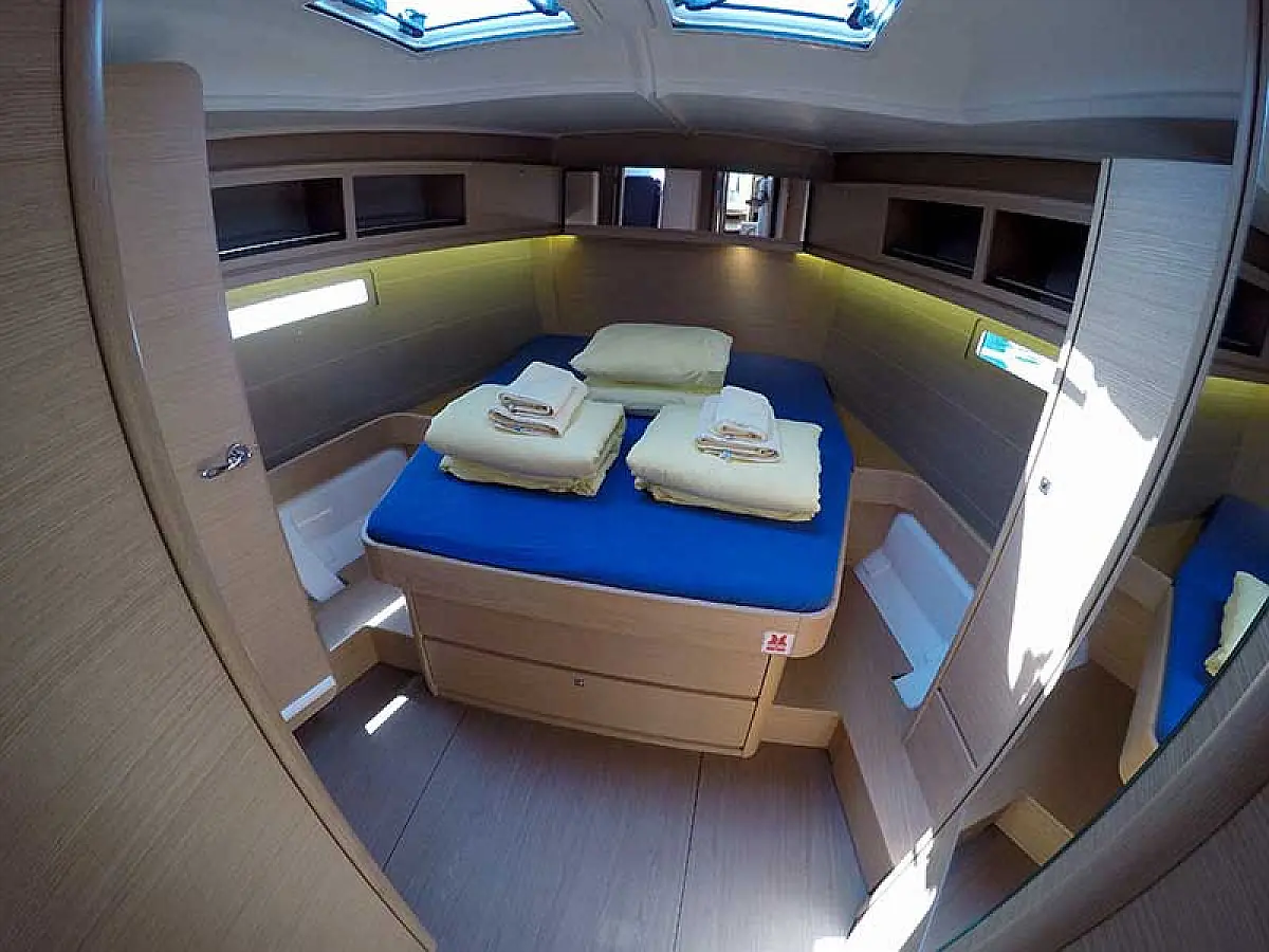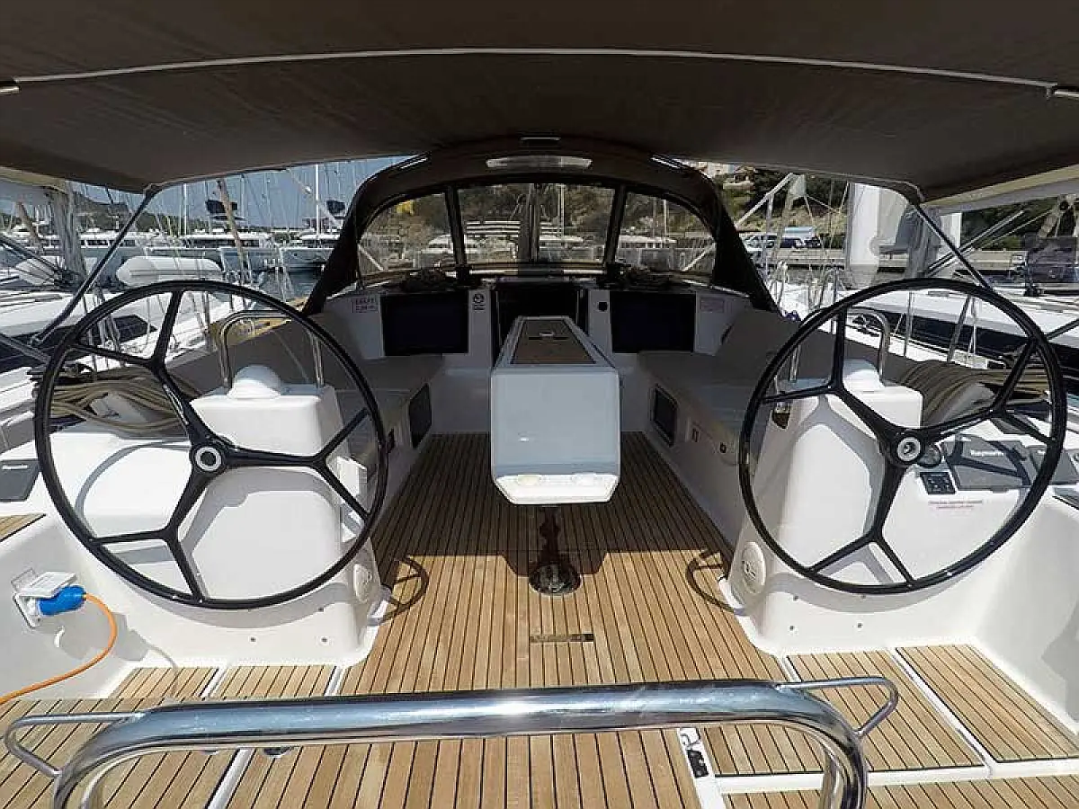 Dufour 460 Avalon II, luxurious owner's version with 3 double cabins + 2 berths in salon and 2 toilets, equipped with jet bow thruster, folding propeller, taller must, upgraded winches + electrical main sail winch, black fiberglass steering wheels, oak interior...